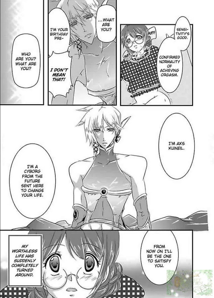 Noel Imai is a negative girl with her head stuck in her books, and no love interest...... On her 20th birthday she receives a present: a super-handsome cyborg from the future! "I'll be the one to satisfy you..." He says as he licks her all over....... "Aah, I'm coming......!!! She experiences ecstacy for the first time, and ends up doing forbidden things in the school toilet! Her first time is taken by the inexhaustible cyborg. She's made to come over and over until she can't stand it anymore......! However, she starts to develop feelings for him, as he stays by her side and protects her......! The laws of time are against them... What will happen to Noel and her cyborg boy!?