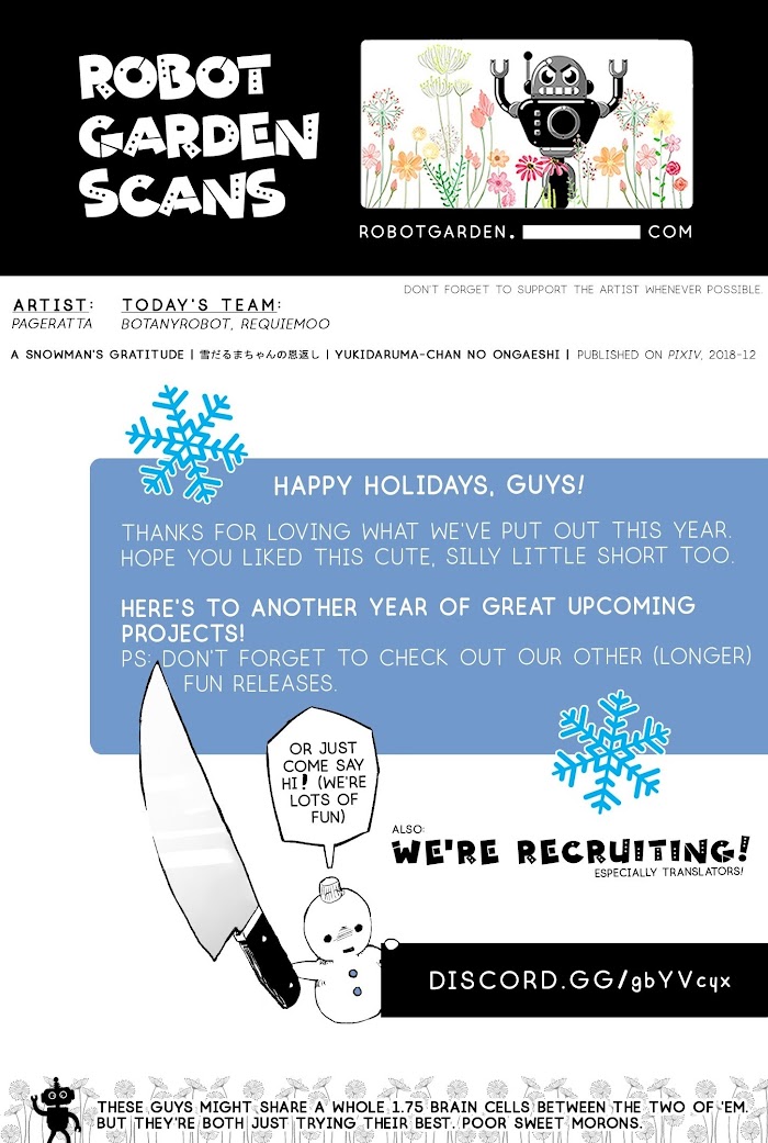 A short little comic about a well-meaning, very tired office worker, and a tiny snowman who, among other things, finds itself a knife.