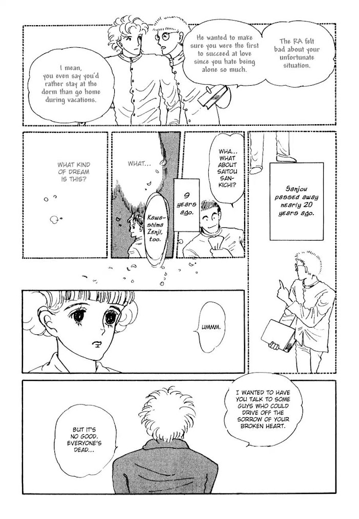 Across a Gold Prairie manga summary: Asahi Sonorama (2000): 1. Kinpatsu no Sougen : Meet NIPPORI Ayumu, an 80 year-old man, who, due to a serious heart condition, has spent sixty years of his life confined to his house. One morning, he wakes up believing himself to be twenty again. In his mind, he has become the youthful young man that he once was. However, reality fails to keep up with his illusion, and everything around him seems to be quite different from what he is used to. So, he decides that he is simply dreaming. As his reality becomes his dream, his unhappy world turns into a life enriched with happiness and expectations for the future. Ayumu is now enjoying his life to the full again. Enter KODAI Narisu, an 18 year-old home-care worker who is newly assigned to look after Ayumu. To his great surprise, Narisu looks exactly like the girl he had fallen for when he was twenty and he immediately mistakes Narisu for her. Narisu, on the other hand, is trying to deal with her own secret love. She is living amidst the uncertainties of youth, struggling to find her way. Ayumu's happy dream. Narisu's fragile and sometimes painful reality. The story takes place in an old house, where these two contradicting worlds intertwine with each other through their words and exchanges. Ayumu gradually begins to realize what is real, until one day, he decides to find out whether what he believes to be his life is in fact a dream. 2. Yumemushi Hitsujigusa 3. Mizumakura Hanemakura 4. Ama no kaguyama 5. Non Regaato 6. Dahlia no Obi Less...