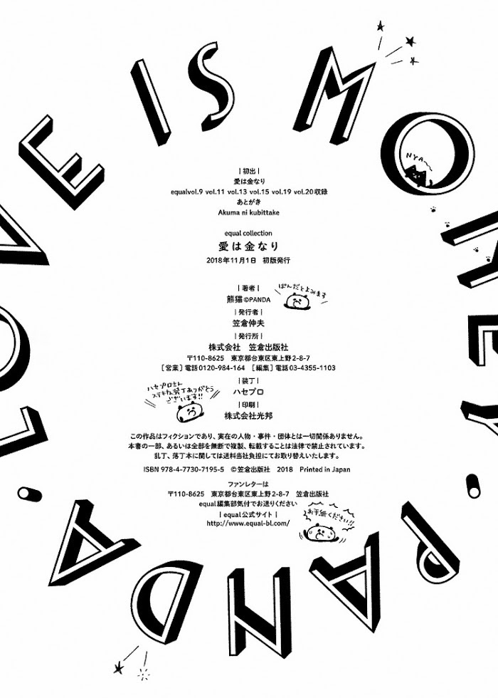 Ai wa Kane Nari manga summary: It is the manly desire that whirls within human beings that Sora is unfamiliar with. Sora ran away from home and escaped to the human world. He was misunderstood at an interview and was picked up by the owner Eriru. Sora is taken to the shop where he begins wondering if his organs will be stolen. "Well, which one are you? Tachi or neko?" Waiting for Sora's answer, who did not understand the meaning of that question, they begin their days filled with debt and pleasure at Paraiso.