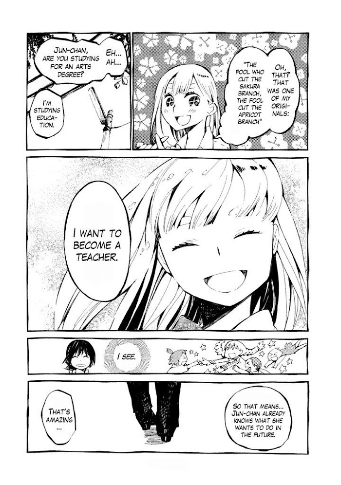 Yamada, Bun is a shy, quiet, keep to herself kind of girl but when it comes to cooking she gets really into it and is an awesome cook. She lives alone with a talking stuffed animal named Hokusai but only she can hear him speak. Bun is fine with her life as long as she has her food and Hokusai. This story is a prequel to Hokusai to Meshi.