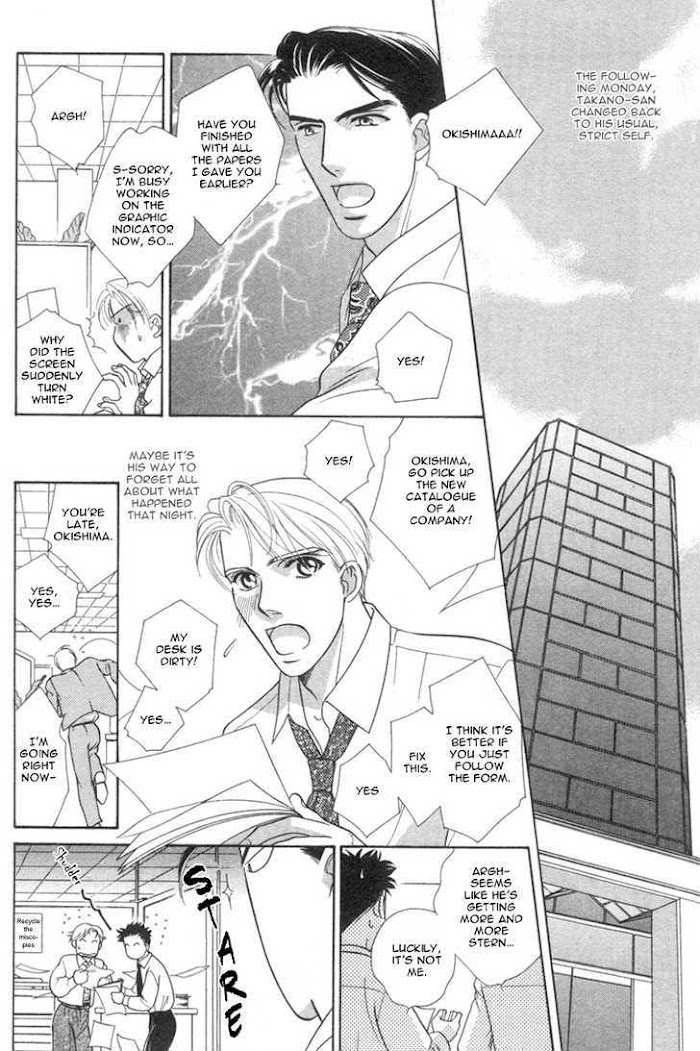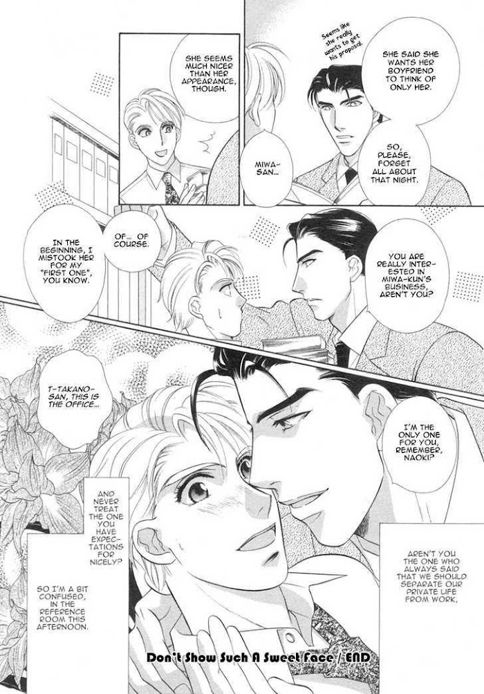 A collection of short stories including: Don't Show Such a Sweet Face: The morning after a drinking party, Okishima Naoki awakes in a strange bed, in a strange apartment, with a strange woman and a senior co-worker! In addition to that, he can't remember anything that happened... (Source: B-U)