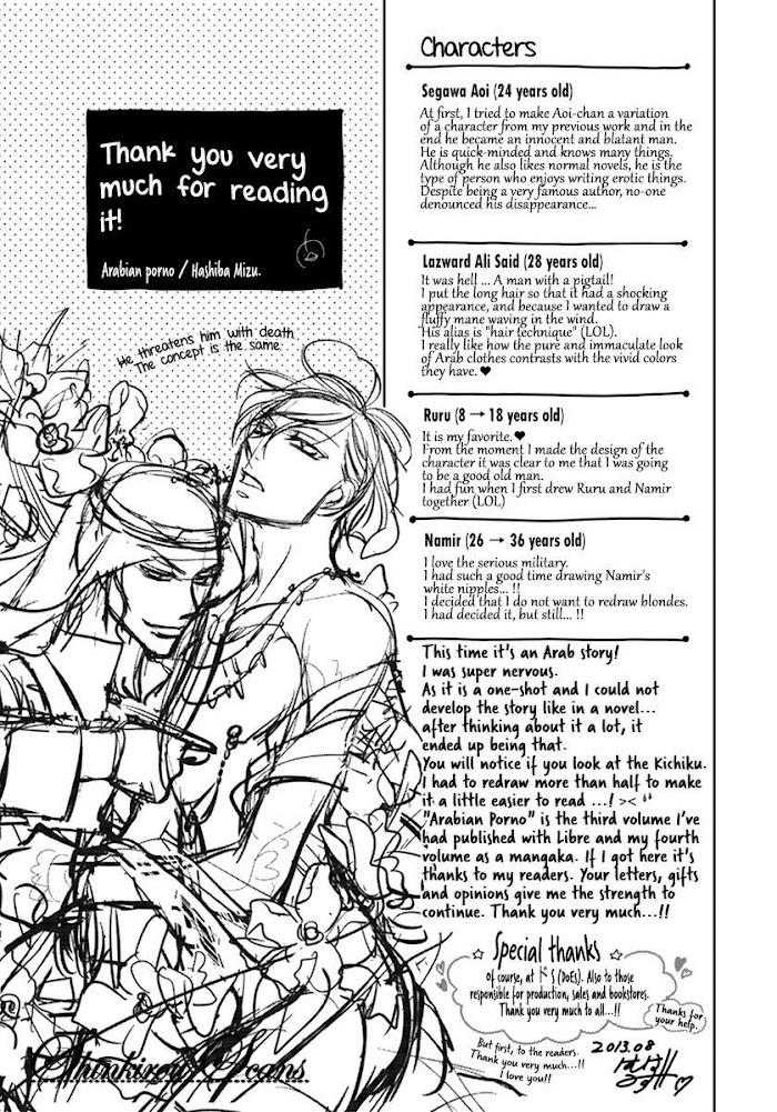 Bi Shinkirou Scans:Since you are a novelist, narrate me with your body the history of your pleasure and your sensuality!!.Now, let's start with our thousand and one nights.From MAL:A novelist visits an Arabic country and saves a little boy from the Arabian prince, and in turn he has to seduce the prince every night before the prince gets bored and cuts the novelist's legs off.