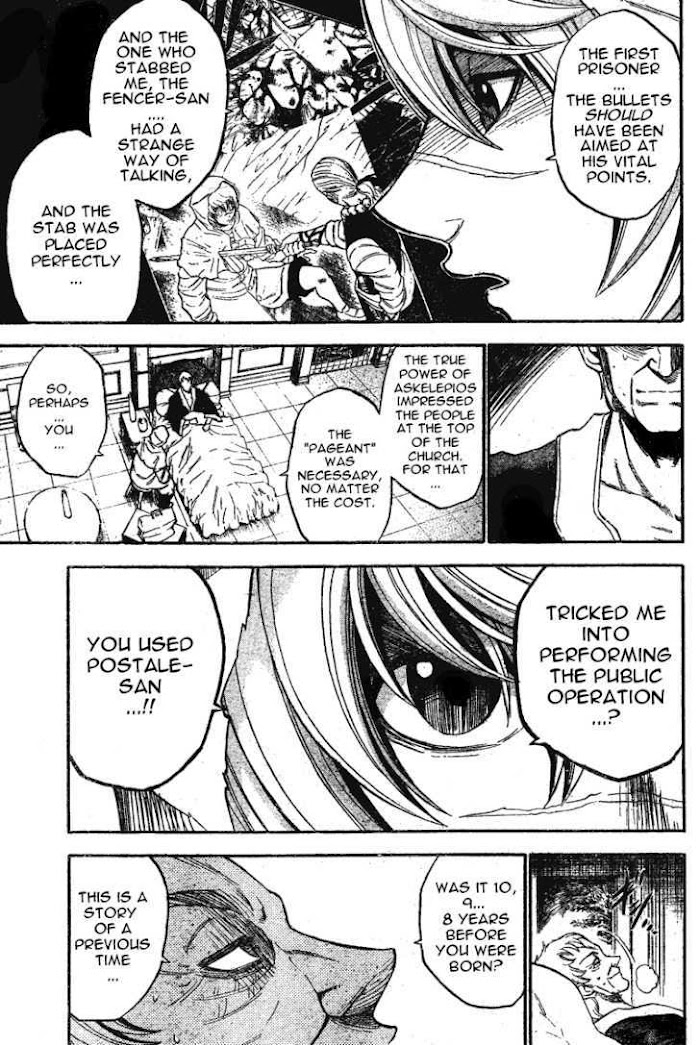 An order has been sent out to hunt down the existence of an Asklepios, a Greek demon god of medicine, whom the Church believes is practicing unorthodox methods. A member of armed force group assigned to this mission by the name of Luca encounters two kids who saved him from an injury he faced during a brawl. Who are these kids and can they help out Luca with his personal reason for doing this assignment? (Source: MU) Included one-shots: Volume 3: Asklepios (pilot), Dispenser