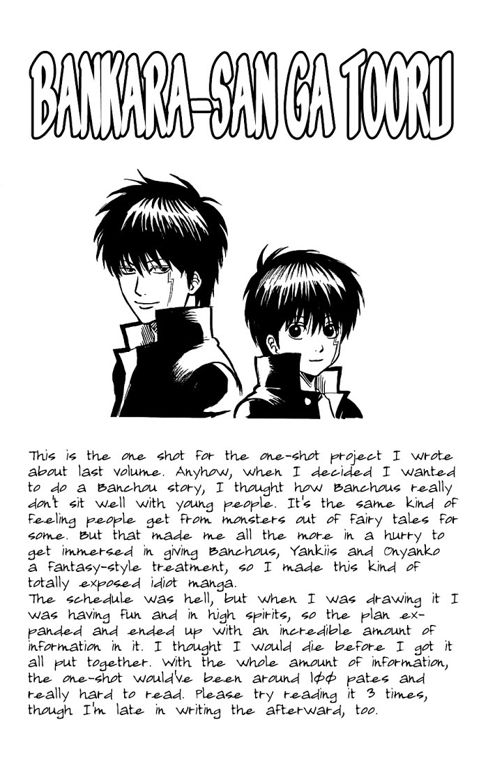 Bankara-san Ga Tooru manga summary: One-Shot by Sorachi Hideaki(author of Gintama) Originally published as part of the Top of the Super Legends one-shot series, It was included at the end of volume 38