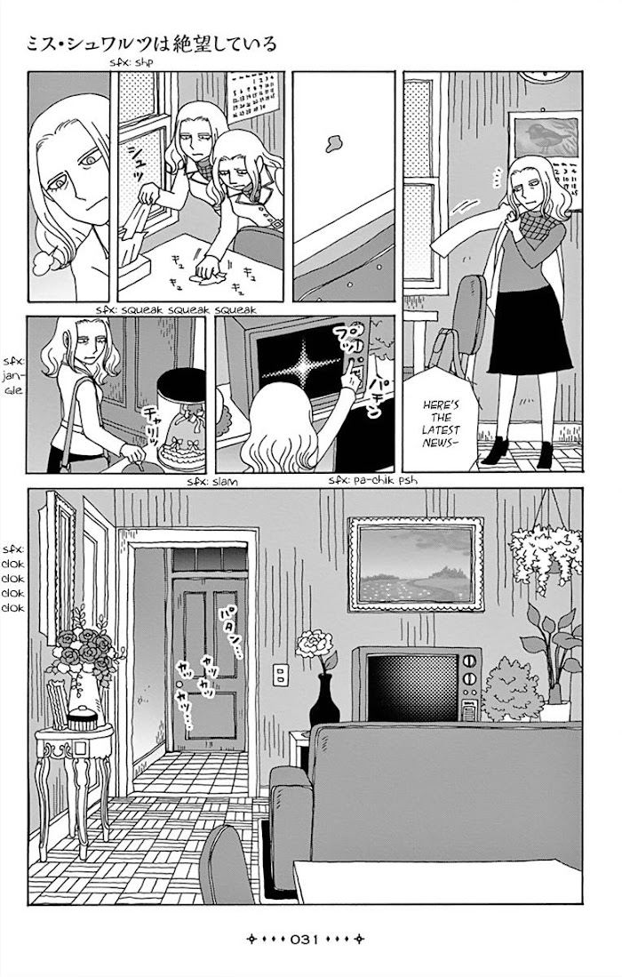 Description : A collection of one-shots by Lun Lun Yamamoto, all done for *Flowers*, filled with bittersweetness and charm.- **Between Us** (ないしょの話, Naisho no Hanashi)- **Miss Schwartz is in Despair** (ミス・シュワルツは絶望している, Miss Schwartz wa Zetsubou Shiteiru): An older woman who isolates herself from others gets a new perspective on things when she meets the town alien.- **Future Prescription** (未来処方箋, Mirai Shohousen)- **My Rose-Colored World** (ぼくのばら色の世界, Boku no Bara-iro no Sekai)- **Cynthia** (シンシア)- **Sky-Blue Lily** (空色のリリィ, Sorairo no Lily)Placed 16th on Kono Manga Sugoi! in 2014.