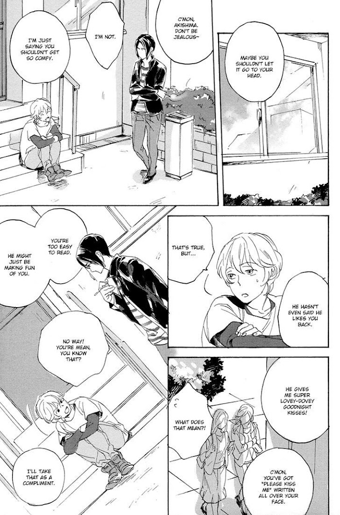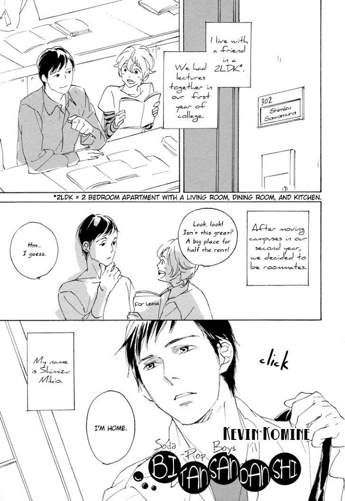 Nao and Tom have been friends since childhood, Nao being the caretaker and Tom being the clumsy airhead. Their high school lives have been fairly uneventful-that is, until Tom suddenly confesses to Nao one night. Though Nao points out the obvious "but we're both boys…?" The second story deals with two college students who're doing a room share. Shimizu Mikio is in his second year of college, and has started rooming with the fluffy, energetic Sawamura Souta. But the more they're together, the more Miki starts to notice something: Souta seems to like him. (Source: MU)