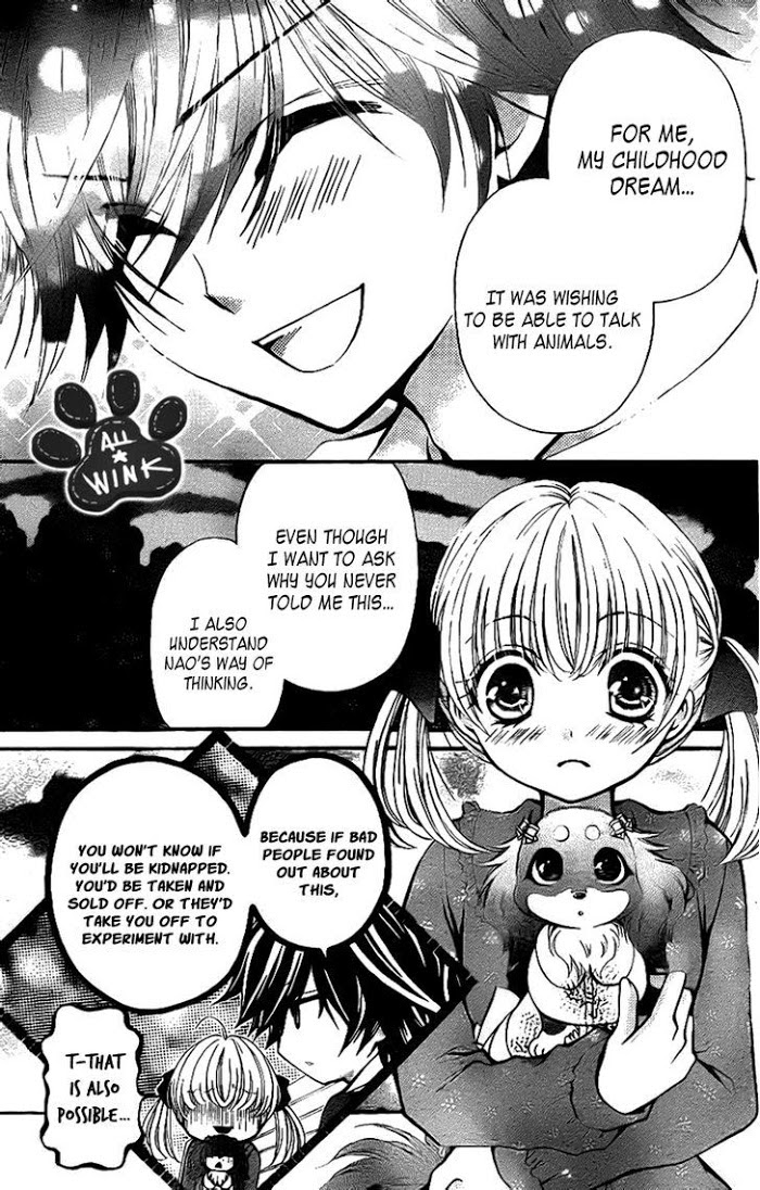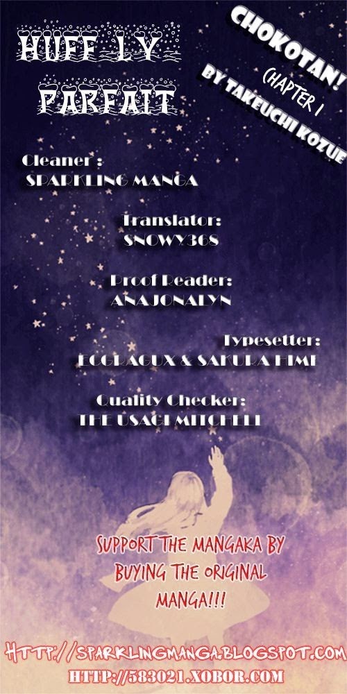 This story is about the dog named Chokotan who has the ability to speak with humans in the human language. Nao, her owner, likes a guy named Arima. Arima has a dog named Hatsupi. On Hatsupi's birthday, Nao makes biscuits that are edible for both dogs and humans. Nao and Chokotan bump into Arima and Hatsupi on the sidewalk and Nao runs away before she can summon the courage to give the biscuits to Arima. Chokotan encourages Nao and she makes up her mind to go back and give the biscuits to Arima. Now then, will she be able to approach Arima while she's not even able to talk casually to him? And how about Chokotan's secret? - The Story about the talking dog and her Owner's clumsy-love-story! (Source: Huffy Parfait Scans)