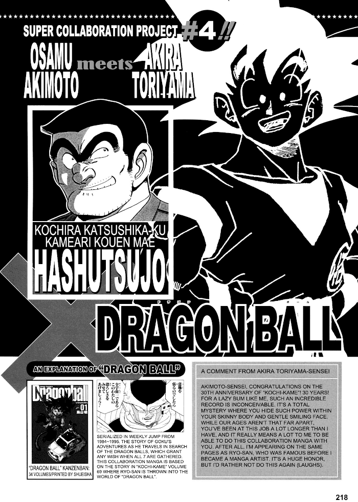 Contains five crossover one-shots with other series. 1. Sousha no Kyuujitsu (Crossover with Golgo 13) 2. Ryoutsu Kankichi VS Lupin III (Crossover with Lupin III) 3. Seigi Choujin Kameari Dai Shuuketsu!! no Maki (Crossover with Kinnikuman) 4. Kochira Namekkusei Dragon Kouenmae Hashutsujo (Crossover with Dragon Ball) 5. Ryoutsu VS Shuuryou Patchi!!: J Gag All Stars Katsushika Dai Soudou!! (Crossover with Pyuu to Fuku! Jaguar, Bobobo-bo Bo-bobo, Taizou Mote King Saga, Maison de Penguin)