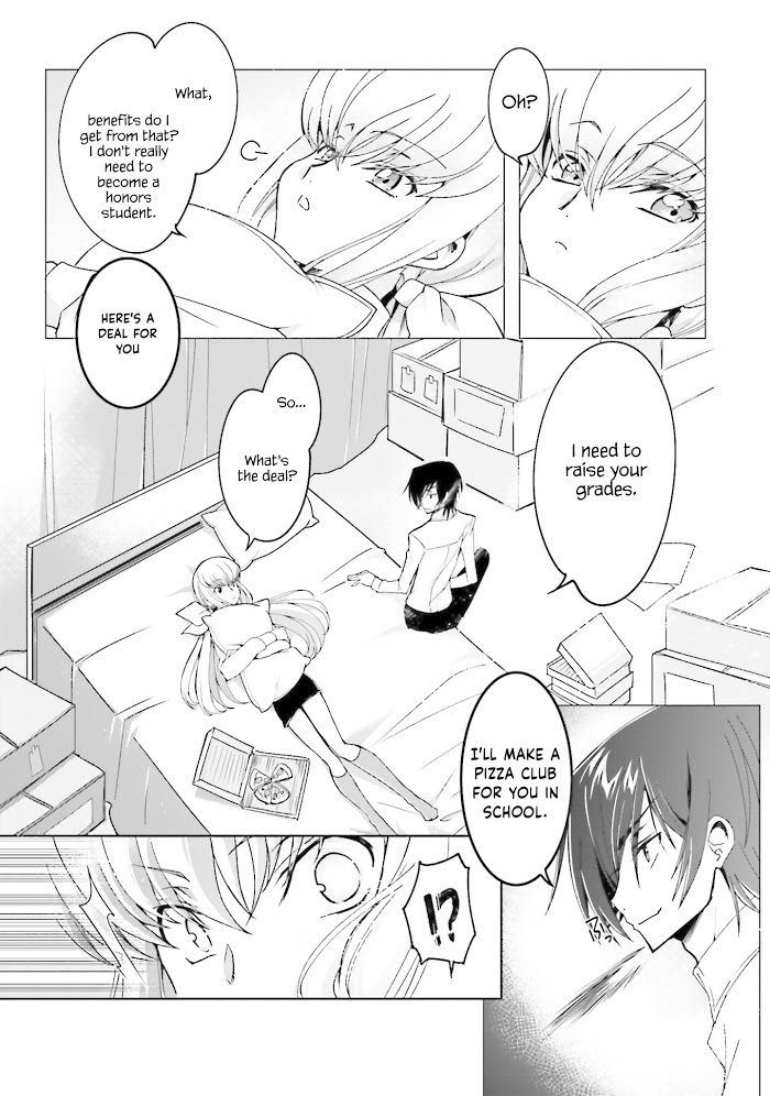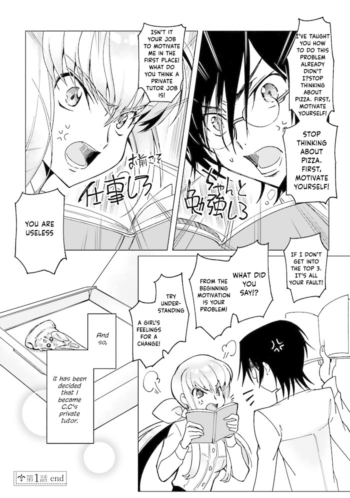 Description :Why has Lelouch become C.C.'s tutor?! Lelouch and Nunnally were living in peace, but then one day a spoiled rich girl with absolutely no common sense named C.C. moved in next door. At the request of his mother, Marianne, Lelouch has taken on the task of ensuring her education – and now he's made a contract with C.C. to be her personal tutor…?! A high school AU comedy begins!