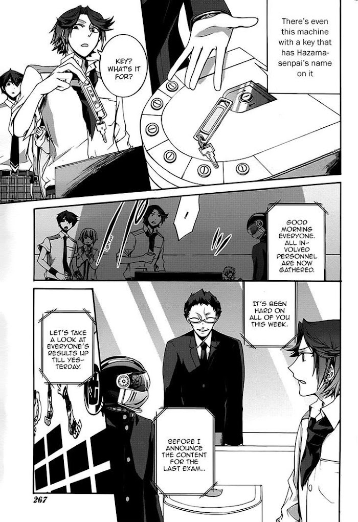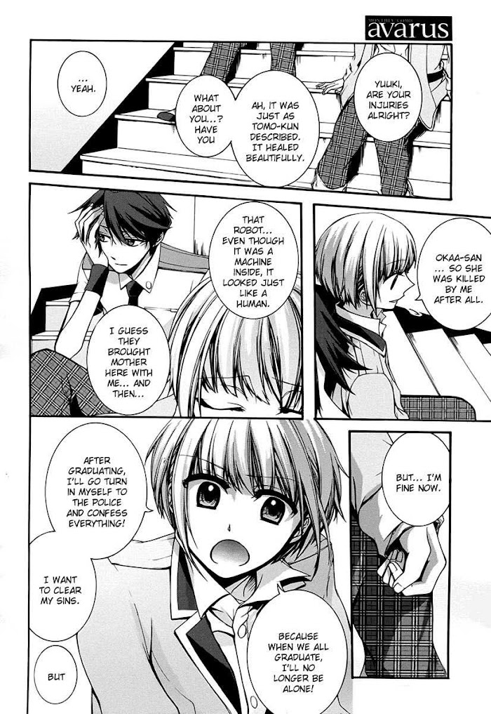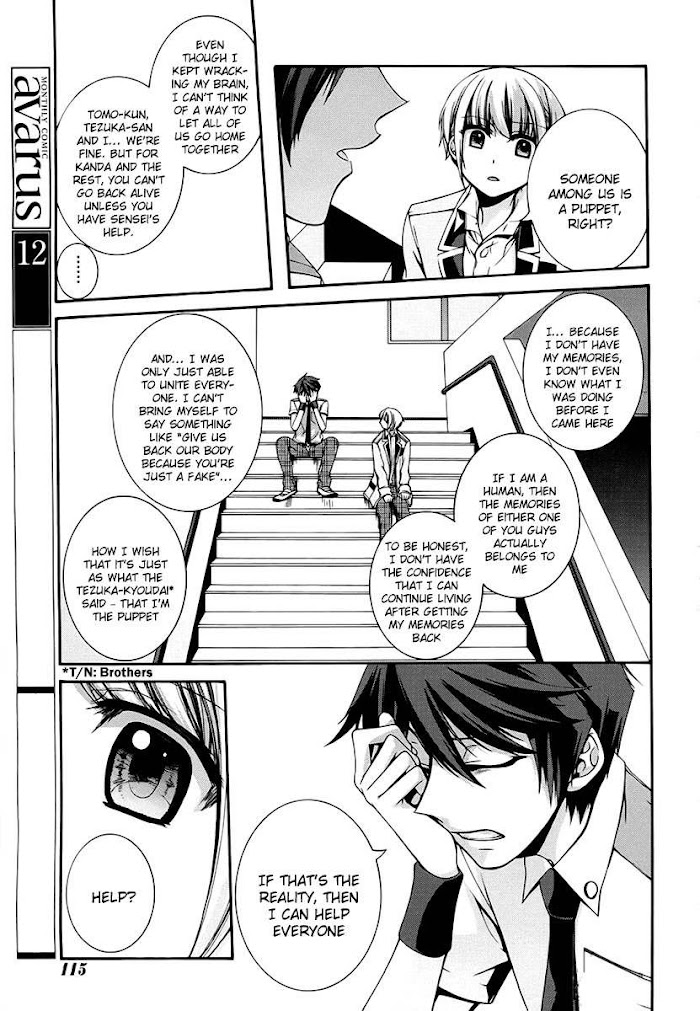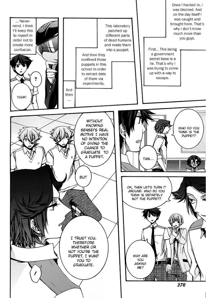 Rumor has it that teenagers who have committed a terrible misdeed in their life will go missing. These young criminals are taken away and never heard from again. When Yuuki Oku awakens, he has no memories and is being driven to a remote school in a car. After arriving, he is led into a classroom. Only six other people are inside. To his horror, he learns that everyone in the room is a criminal, including himself. As students of the class, each and every one of them is incomplete. Whether it's a limb, a heart, an entire head, or-in Yuuki's case-memories, they have all had something vital removed. Though there are seven people in the class, they are told that one of them is not human, but a puppet constructed from their stolen body parts. To escape, Yuuki must first earn the right to graduate in a week's time. But even if he does, he must also identify which of his classmates is the puppet and take back what was once his. [Written by MAL Rewrite]