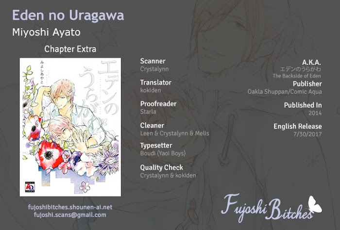 Eden no Uragawa manga summary: From Fujoshi Bitches Photographer Akiba is indebted to Arimura for giving him work so he is asked by Arimura to take a young man under his wing. He takes in a guy named Ikumi who seems to be involved with the straight Arimura. Even though they are lovers, Ikumi has no idea when Arimura will be back. Regardless of what he does in this complicated situation, Akiba gets depressed about this troublesome mess he has gotten himself in, but Ikumi's innocent nature proves to be likable and living with him is surprisingly pleasant. The dazzlingly gentle blessed days of an up-and-coming photographer and a freeloader uke!