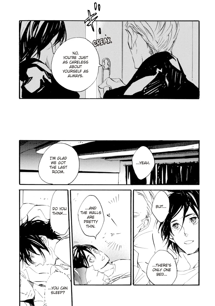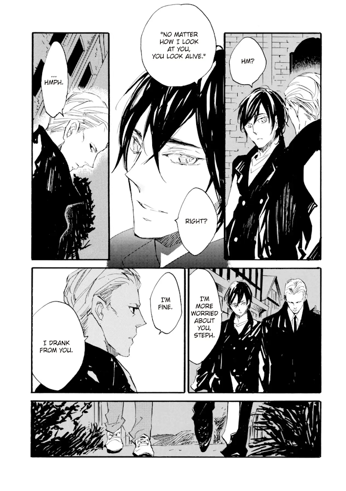 Stephen and Shukurei are vampires who met and decided to travel together. One a half-demon, the other a subspecies. One lives for the sake of atonement, the other for the sake of revenge. In the midst of the journey, Steph drinks Shuku's blood and experiences once more the warmth of companionship. But when they arrive at Steph's hometown, the past begins to catch up, torturing Steph with sorrow and contrition. Shuku's father, whom they meet during the journey, reveals a startling fact, and Shuku intends to fulfil Steph's unexpected wish. What will they find at the end of their journey...? (Source: Momocha Scans)