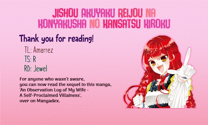Fiancée's Observation Log of the Self-proclaimed Villainess manga summary: Crown prince Cecil was so brilliant that everything in life was easy to the point of boring him, then one day, his fiancée Bertia suddenly said "Prince Cecil, I am a villainess!" Claiming that this world is the same as that of an "otome game" from her past life and that she is playing the role of the "villainess" in it, she aims to play her part well and have their engagement annulled. With that goal in mind, she sets about causing turmoil in Cecil's daily life.