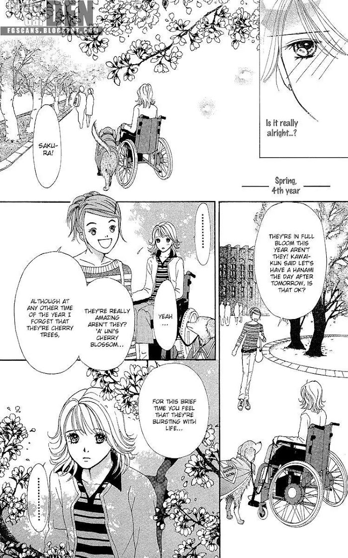 Flower (WADA Naoko) manga summary: 14 year-old Aoi is an upbeat girl who has big dreams for her future, though her main one at the moment is getting into N High. Aoi is both popular and pretty, even being voted Pure Teen Magazine's reader-model. Accompanying her is her childhood sweetheart Ryuuta, the number 1 slacker in the school. Though the two bicker often, mostly about Ryuuta's consistently low scores and lack of studying, it is apparent that they both harbor feelings for one another. Unfortunately, Aoi's dreams and love are tested when an accident renders her handicapped. Aoi and Ryuuta must now find a way to cope and see if their love endures the many trials ahead. (from Forbidden Garden)