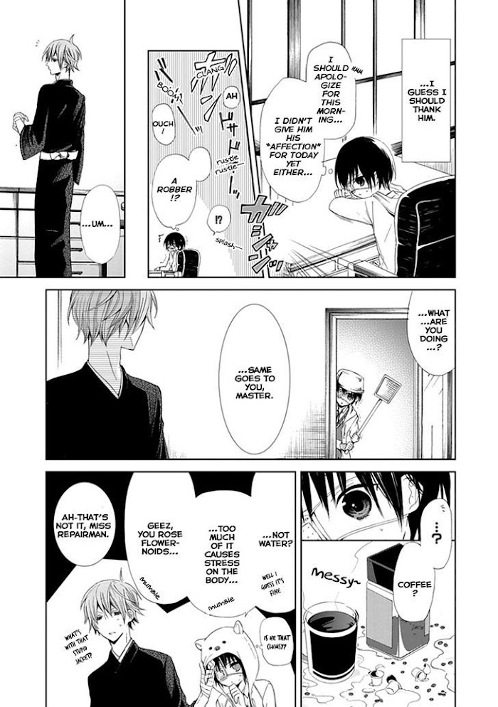 "Flowernoid", dolls created with the special nature of flowers, and who devotes themselves to a master. This is the story of Satsuki, a master flowernoid repair specialist whose daily life changes by happening upon a lovely flowernoid. "From now on, I belong to you" the flowernoid claims. (Source: AQUA Scans)