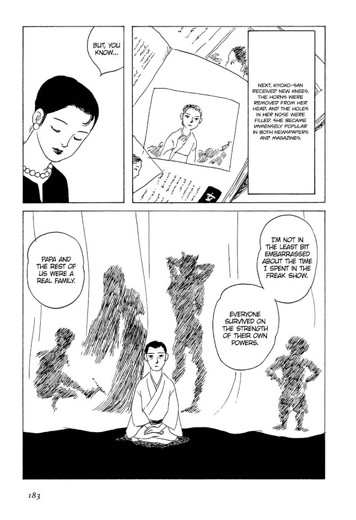Circumstances have intertwined the fates of five strangers. As a team of five, they make their living running a freak show. As a family of five, they live on a small boat together. In the midst of a terrible war, they add to their number the kudan, a monster rumored to tell the future. (Source: MU)