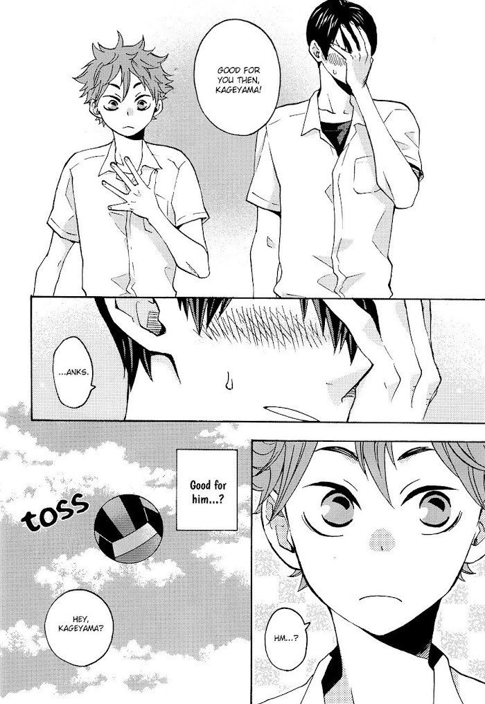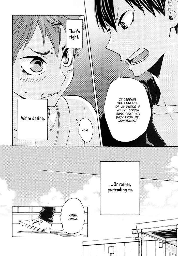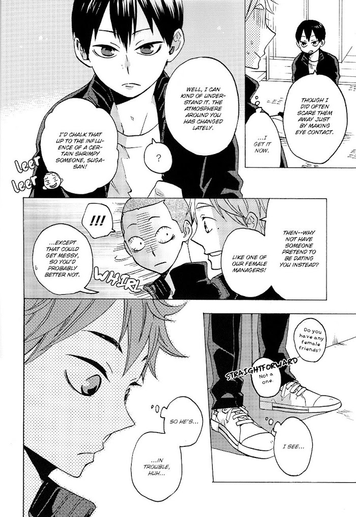 From September Scanlations: Pairing: Kageyama x Hinata Kageyama is being harangued by girls confessing to him – so Sugawara offers him a helpful suggestion: find someone to pretend to be dating to throw them off.