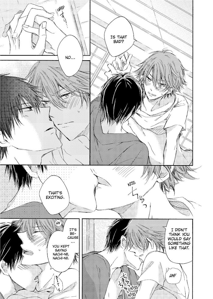 Tsujido Ei, who is a flower arranger, has struggled living with his step-brother, Natsuki, who he has strong feelings for. But trying to be the "Good Younger Brother" is starting to become harder as Natsuki keeps feeling skin on skin. Out of no where Natsuki in just underwear, hugs onto me, he smells so amazing. "As your older brother, I'll take the responsibility of protecting you..." wait is this a delusion?! A love comedy that makes the family relationship go crazy!!