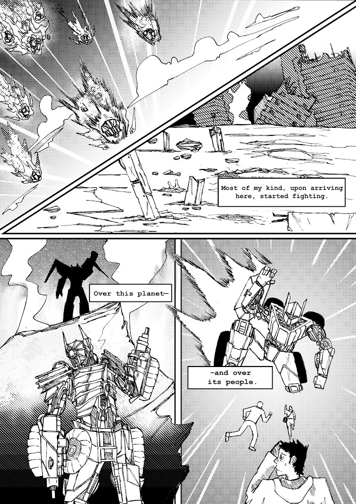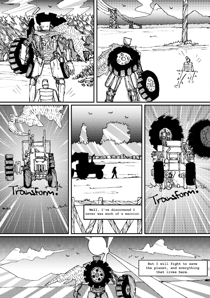 Harvester is a five-page one-shot comic about a tranforming tractor robot, which arrives on Earth and shortly realises that as a farmer and an ecologist, Harvester has to fight just as much as being a soldier.