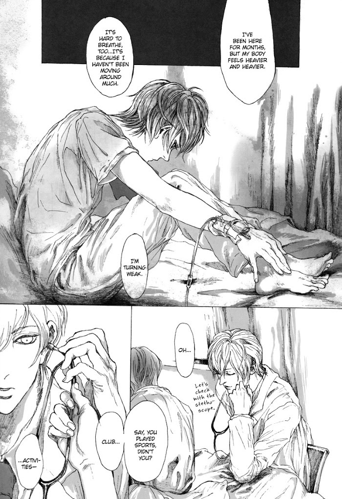 Healing Elegy manga summary: Stuck by a disease that's slowly eating him away, Ryou yearns to be free from the cage, to breath in fresh air on his own. His doctor tries to relief him of his pain while searching for a cure to the disease. Healing Elegy's a bittersweet story focusing on the interaction between doctor and patient.