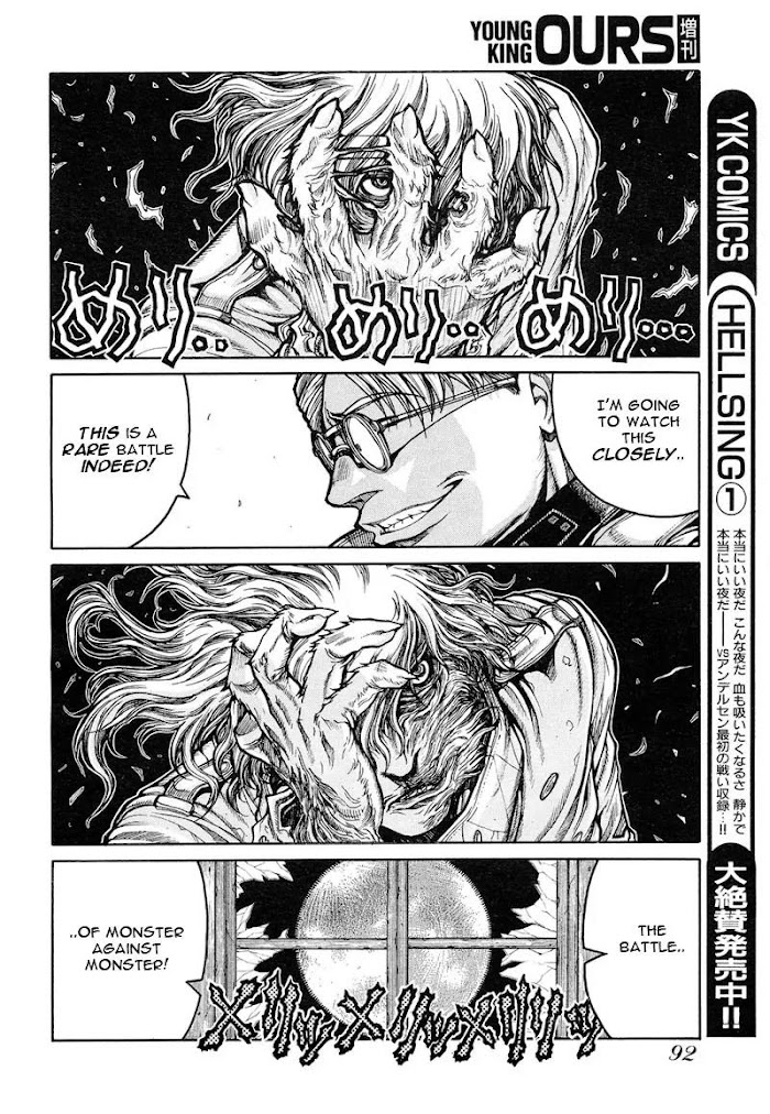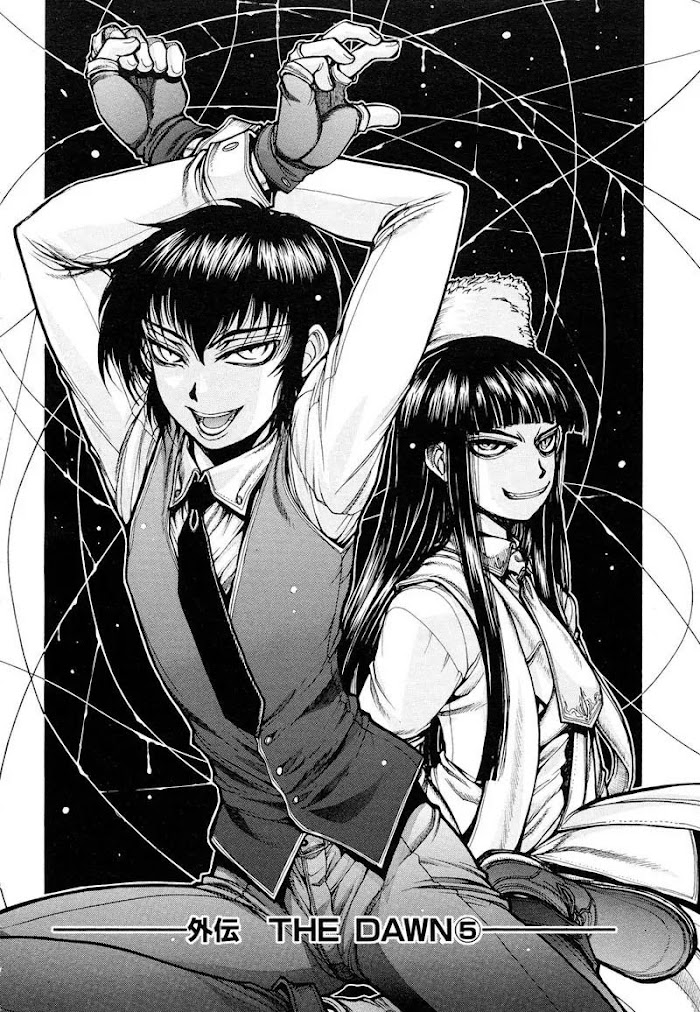 Hellsing, an organization devoted to the elimination of the vampire threat, has recently uncovered information regarding the attempted production of "man-made" undead. The world is presently in the thick of WWII, and the current leader of Hellsing fears the Nazis could potentially use these creatures as front-line super-soldiers. Although the technology of creating artificial vampires is still in its infancy, it has advanced enough to be a serious threat. In an attempt to put a stop to this perverse and dangerous experimentation, Hellsing has sent two of its most skillful agents to Poland. A young man by the name of Walter C. Dornes - a.k.a. "The Angel of Death," and Alucard, an ancient vampire currently in forced service to the Hellsing Organization. Together, they attempt to stop the progress of the Nazi's efforts. (Source: Vimanga.ru)