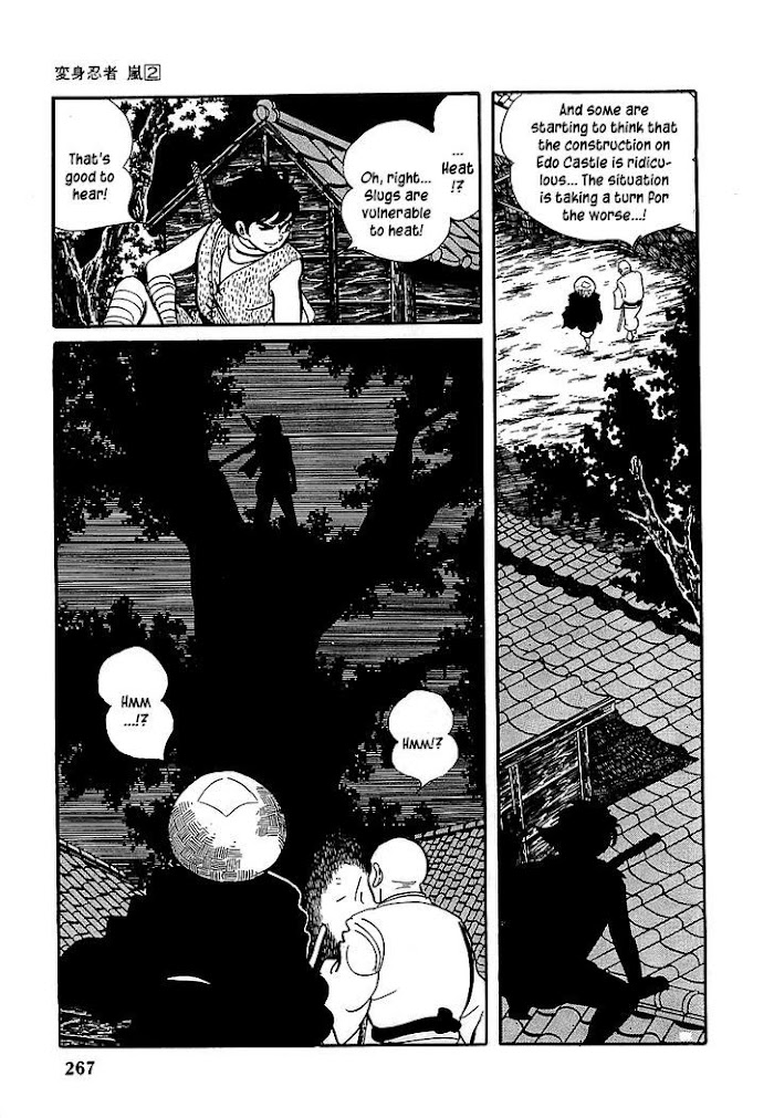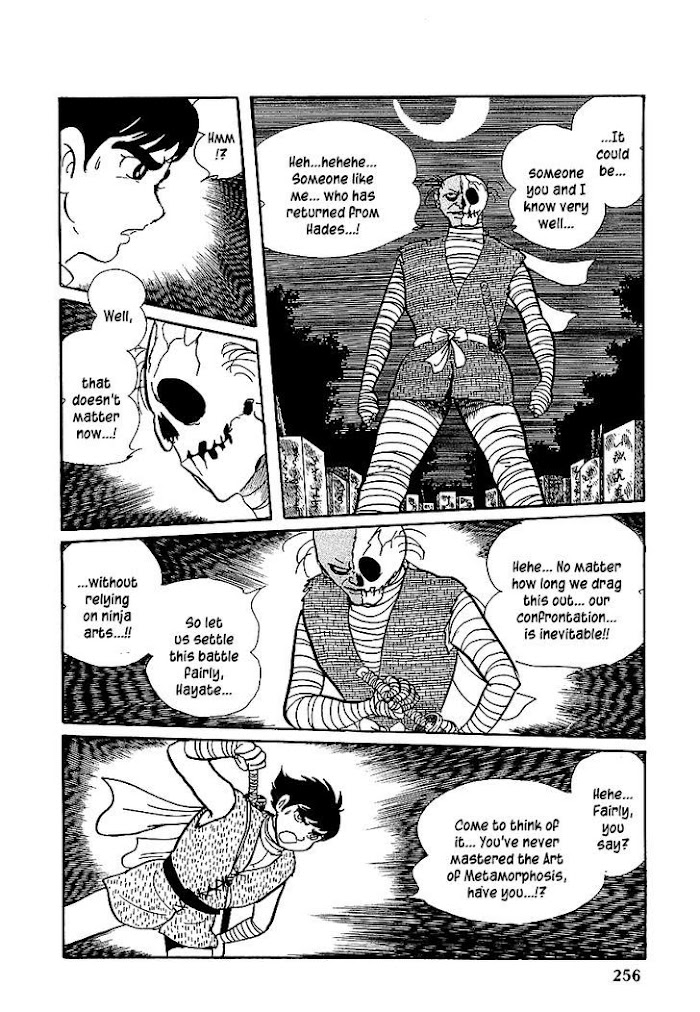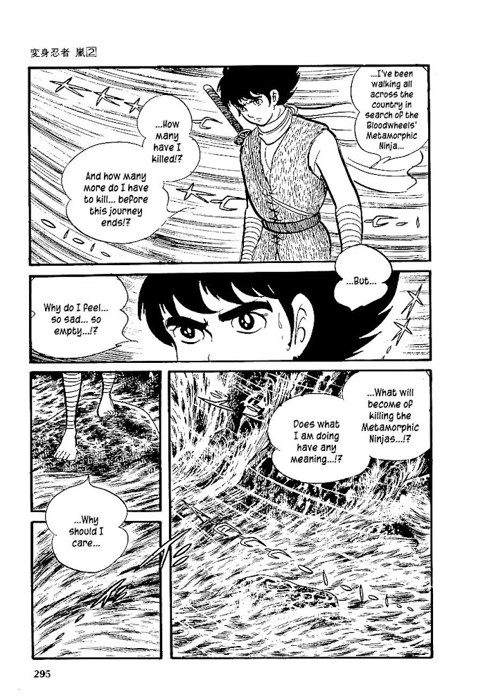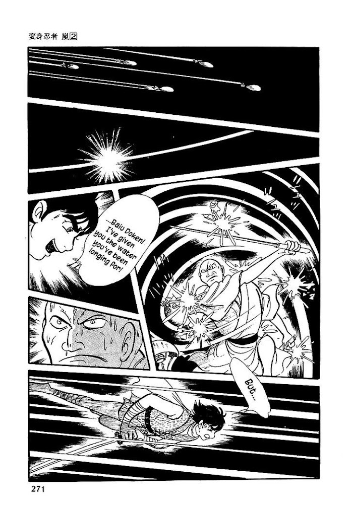 Hayate's father, Tani no Maju (another loyal "Chiguruma Tou" clansman) had discovered and developed the "Ninja Henshin Jitsu" (Ninja Transforming Magic/Techniques) that enabled man to transform into super powerful "Keshin Ninjas" (Spiritual Ninjas) who would be able to summon and utilize their own inner mystical powers. Majin Sai wanted to use this technique to further "Chiguruma Tou's" cause and make their warriors invincible. Tani No Majyu resisted handing Majin Sai the secrets to this technique believing that in the wrong hands, this technique could pose a monumental threat to Japan. Majin Sai sent one of his "Youkai Ninjas" (Supernatural Ninjas) to steal the secrets of this technique. In the process Tani No Majyu was killed but not before he had shown Hayate the secrets of this process. Enraged, Hayate uses these techniques to tap into his inner mystical powers and becomes the super powered ninja "Arashi" (Storm). (Source: MU)