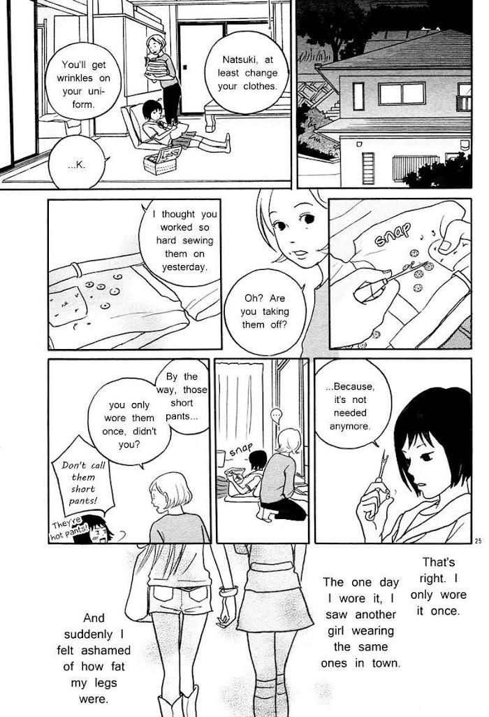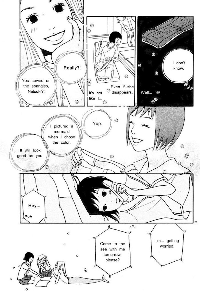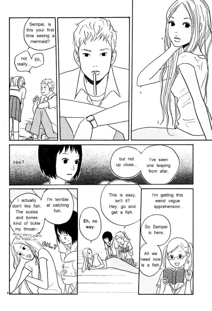 Collection of five short stories revolving around mermaids and mermen. Sayonara Spangles: Natsuki and Ec-chan are friends with a mermaid who dreams of growing legs. With the help of a spell book and Natsuki's crush, Mizuno-senpai, the girls hope to fulfill her dream; unfortunately, the plan brings some unwanted complications. (Source: MU)