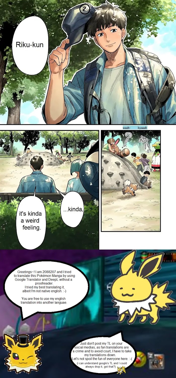 A young student is unsure how his future looks like. He isn't the only one uncertain on this path. Along with his Partner-Pokmon Eevee, they explore and think about what they want to become one day. (If I could, I would officially translate mangas with 0 japanese knowledge.