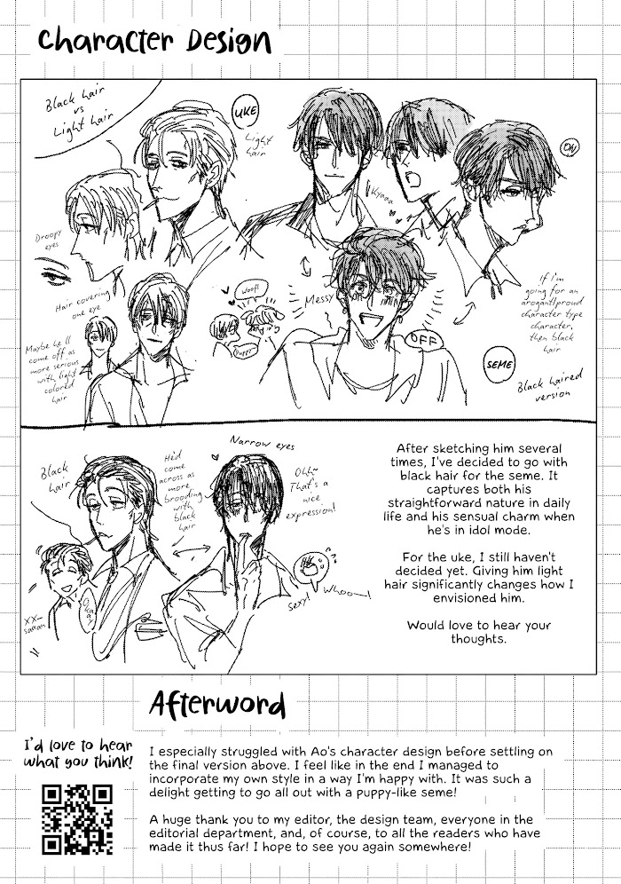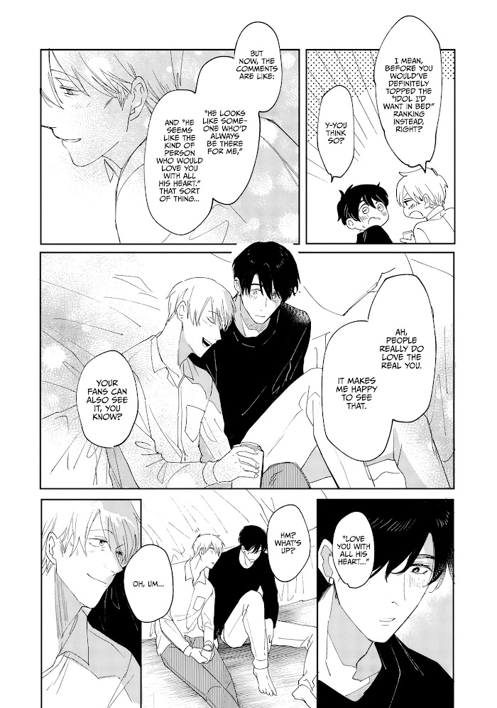 The cool and popular number 1 idol, Ao, is actually a puppy-like shy loser. He asks for fan-service lessons from the former idol Shinji, who replied with "Let's be fuck-buddies," as his only condition. But... "We're not doing it until the performance?!" The honest and truthful Ao becomes impatient when they don't do it at all! In the midst of this drama, Ao realises his feelings for Shinji. Shinji, who's timid when it comes to love, tries to end his relationship with Ao... who suddenly becomes serious?! "Please, face me."The naive, puppy-like idol suddenly became the ideal boyfriend!