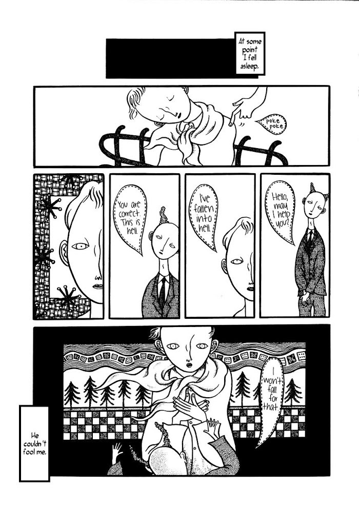 Weird, tripped-out collection of one-shots. Subtly twisted, delicately detailed but with a strong line, with elongated bodies and shades of Art Deco. Somewhat reminiscent of both Gorey and Dali by way of Edvard Munch, but the style is unique and distinctive and very much the artist's own. About as far as you can get from manga and still be in the same country.