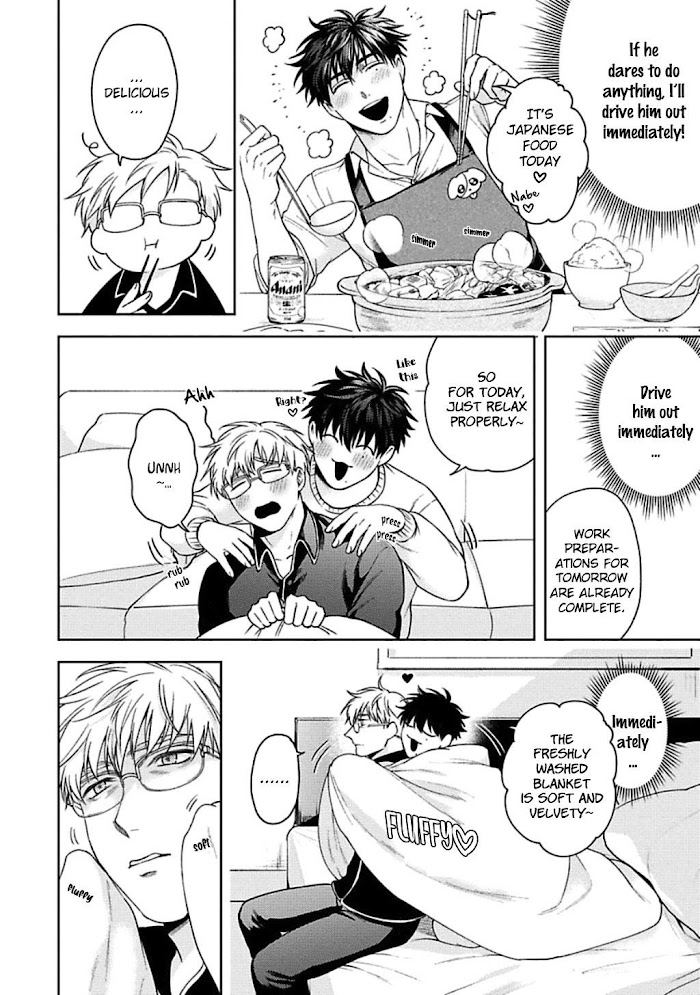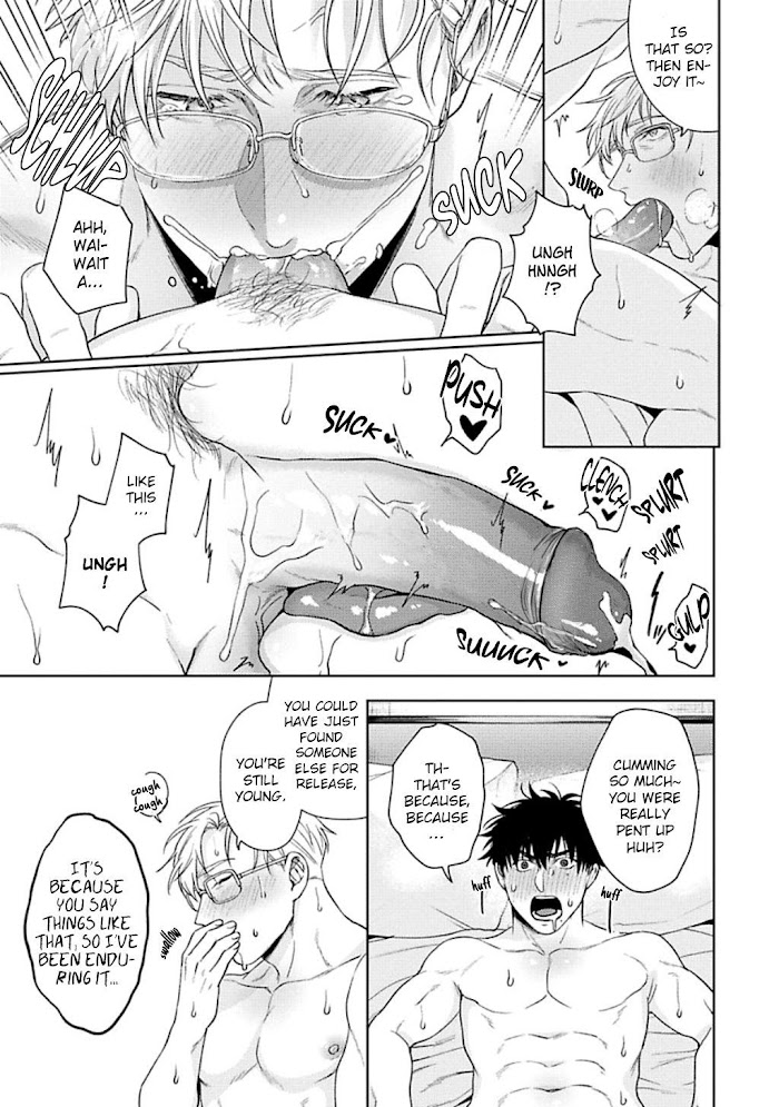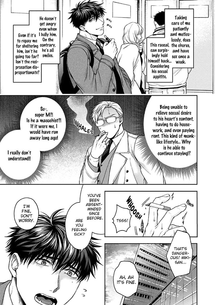 [From BL Tsundoku Scans] With no fixed sexual partner, the single Miki Sousuke, whose life motto is "work and private life should be chic", went about his one-night stand plans as usual. However, what awaited him was his subordinate, the handsome top-dog of the department, Kai Tooru. Three months ago, Miki slept with Kai, treating him like any other one-night stand partner. Now, Kai sticks to Miki every day, while Miki avoids Kai like a plague, using any means possible to make Kai hate him. "Ahhh! What should I do to stop you from haunting me?!"