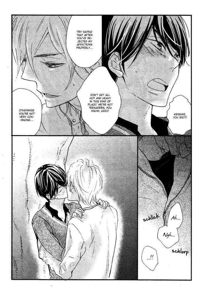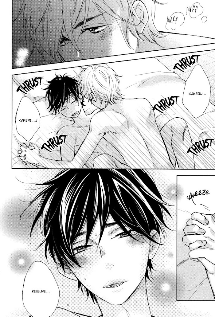 Mio Keisuke is a high-schooler who leads a rather dull, boring life. He can't keep a girlfriend, because being a kept man's too much of a hassle, and he can't bring himself to fall in love and please his woman. Then one day he seeks shelter from a sudden downpour under the awning of an apartment owned by Yugi Kakeru, and suddenly his life isn't so dull anymore as he finds himself falling for his aloof and yet obviously lonely friend. (Source: September Scanlations)