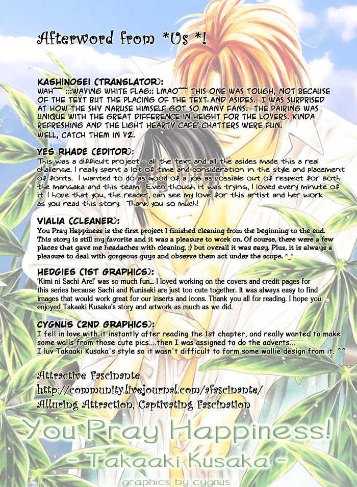 Naruse Sachi left his student ID at Happy Villa. His kouhai, Kunisaki picked it up and wants to return it. But does Kunisaki expect any favor in return? Sachi's cuteness is making Kunisaki all nervous and excited. Will Sachi accept being pursued by this first love of his life, his kouhai, and a guy on top of that? (Source: Attractice Fascinante Scanlations)