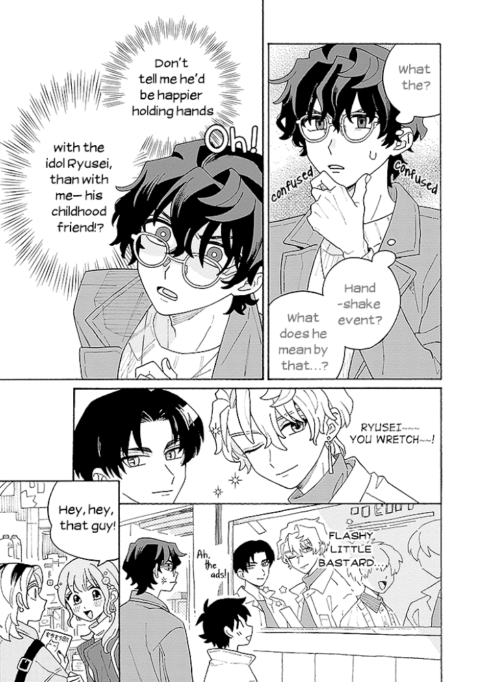 Description : Ryusei, a handsome idol who is rapidly gaining popularity, has a crush on his childhood friend Daichi. However, Daichi is obsessed with the "idol Ryusei,'' and even when he approaches him, he doesn't turn around. On the other hand, Daichi also secretly has a crush on Ryusei, but he hides his romantic feelings for him and supports "everyone's idol Ryusei"...? A love story between a popular idol and a healthy childhood friend, with mutual unrequited love ♡