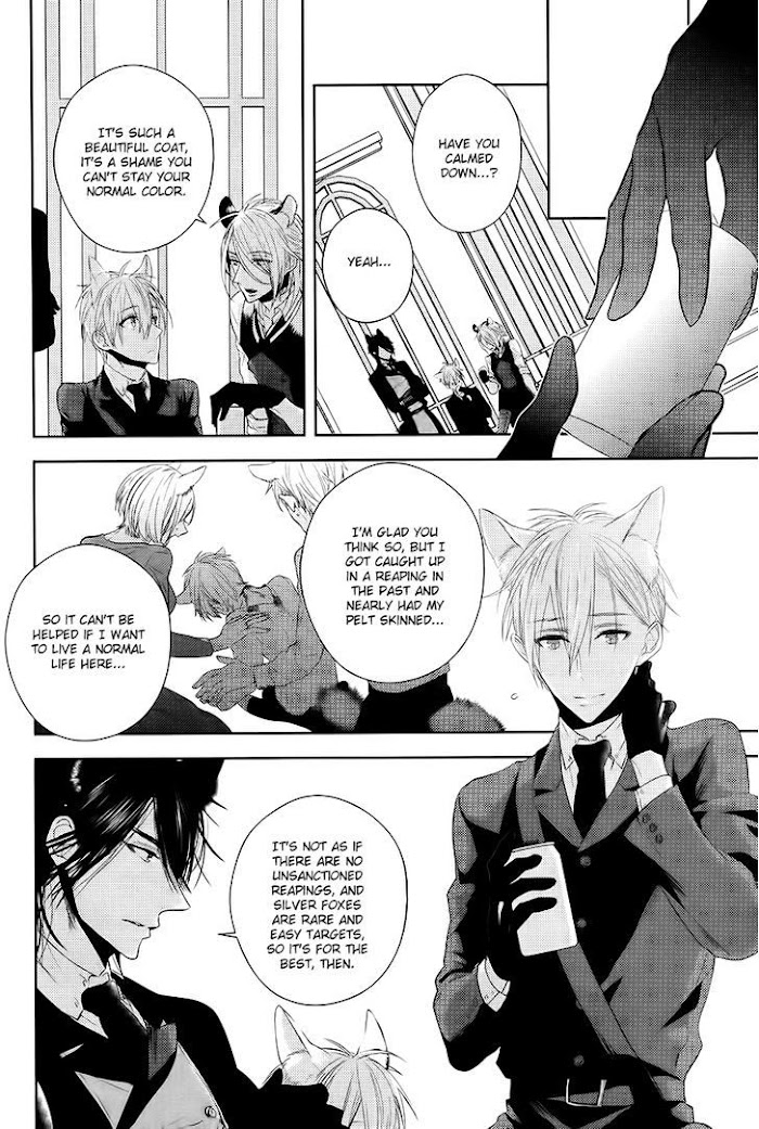 Kuzunoha is a Fox, a member of the Vulpine Faction at his school for Beastlings, and while he gets along well with his kind and the Feline Faction, the Lupine Faction scares the mess out of him because they still practice the ancient rite of pelt reaping, where in traditional ceremonies they skin their fellow beasts. But when he wanders into the forest on an urgent errand and winds up stumbling into the middle of a hunt, he must rely on the help of a Wolf classmate of his to reach safety, because Kuzunoha isn't all he appears to be at first blush... (Source: September Scanlations)