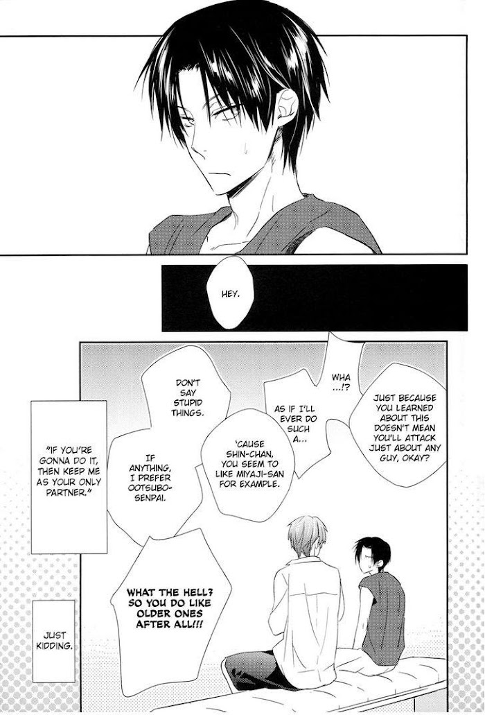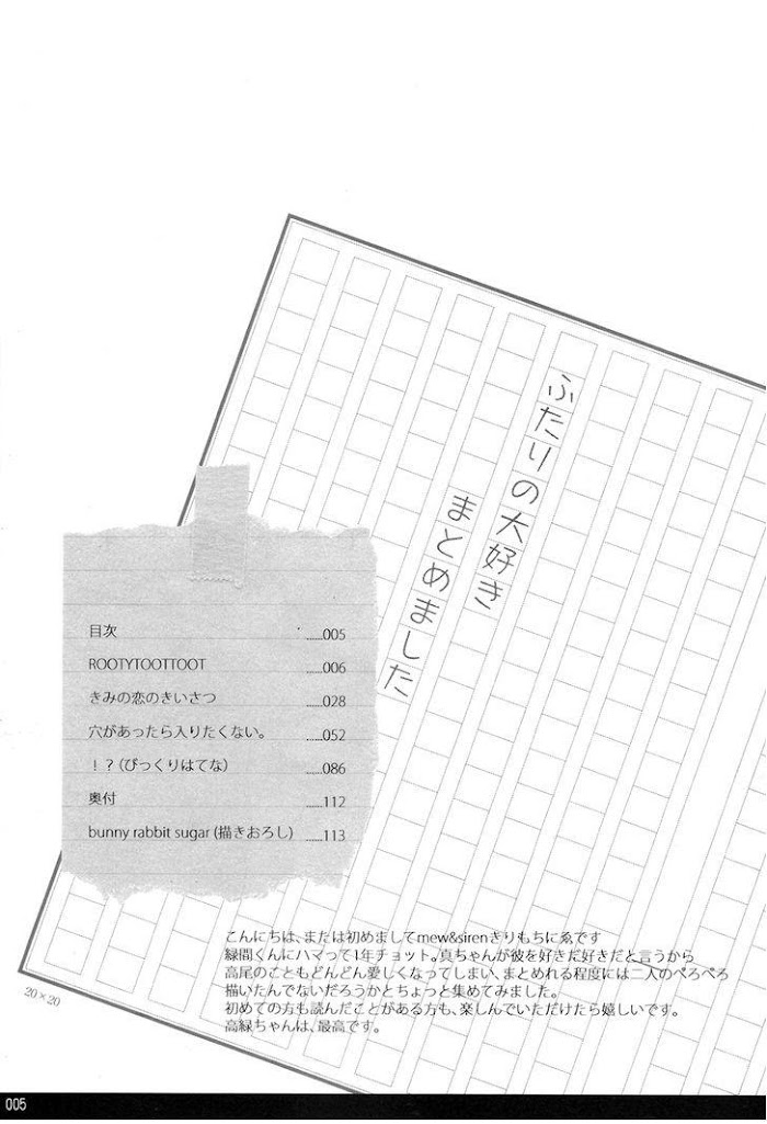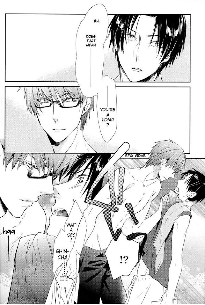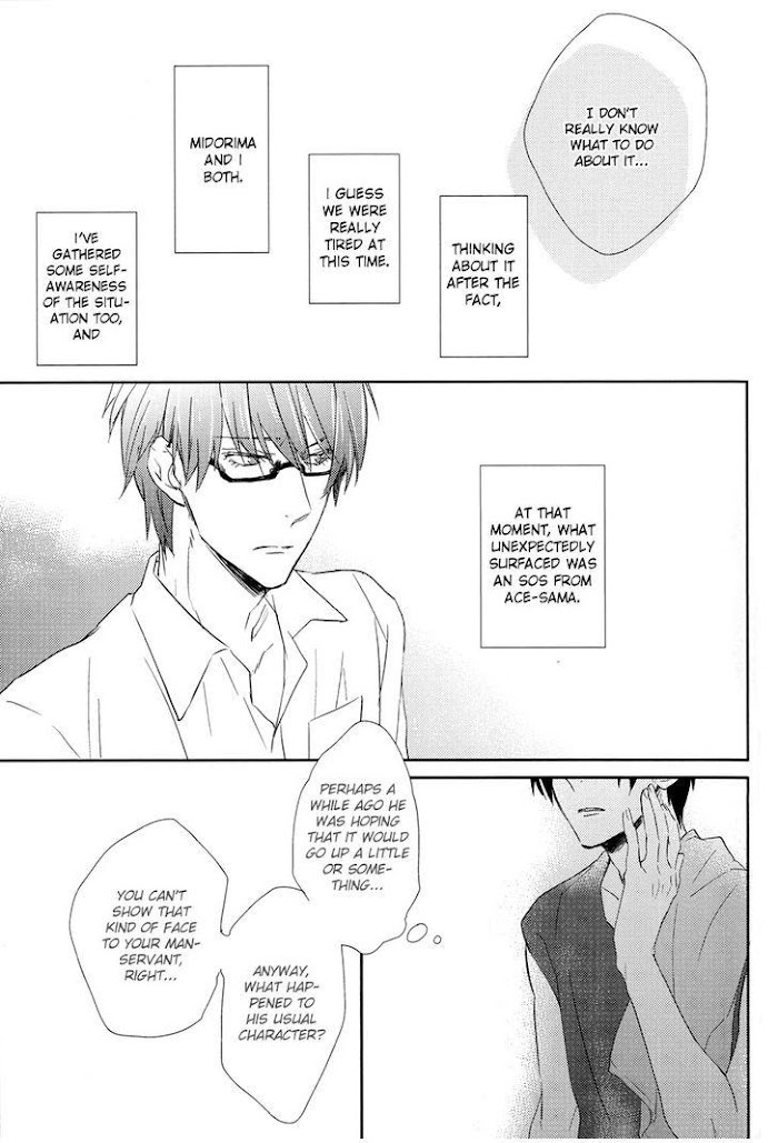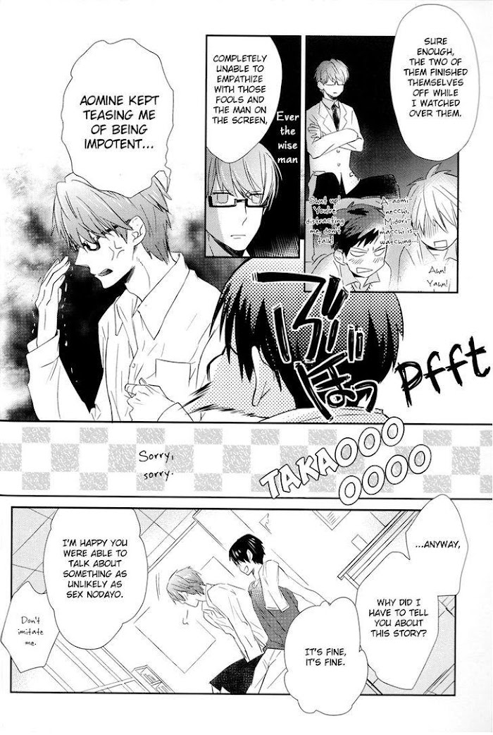 Pairing: Takao x MidorimaThe third story in the compilation book Futari no Daisuki Matomemashita. [...] the story revolves around Takao who's been building up sexual frustration and Midorima who couldn't care less about it. But this time, Midorima happens to have an unusual problem...