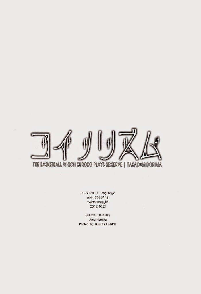 From Yefione Translations:Pairing: Takao x MidorimaThis is a short doujinshi about Midorima getting jealous. [...] half of the book is a novel.