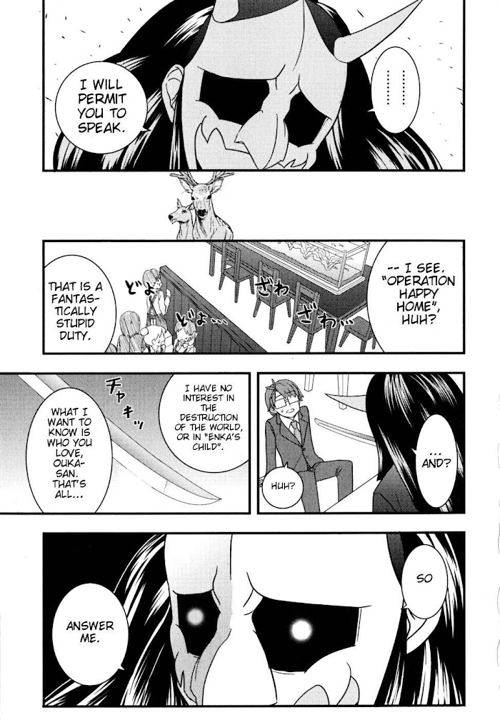 Thousands of years ago the God of destruction, Enka, died saying thats its child would destroy the world.Thousands of years later the potential children of Enka are found (some human, some not) and take part in the Peaceful Family Operation in order to discover who the true child of Enka is and stop them from destroying the world by teaching them the importance of family love. The novels depict the not-so-normal life of a "family" that includes a catgirl "mother," a lion "son," a living land-combat android weapon "son," a jellyfish-like otherworldly "daughter," and a hapless 27-year-old military officer as their "father." This motley "family" was assembled as part of the Imperial Japanese Anti-Paranormal Phenomena Section's Special Operations Forces to save Earth in 2063. (Source: ANN)