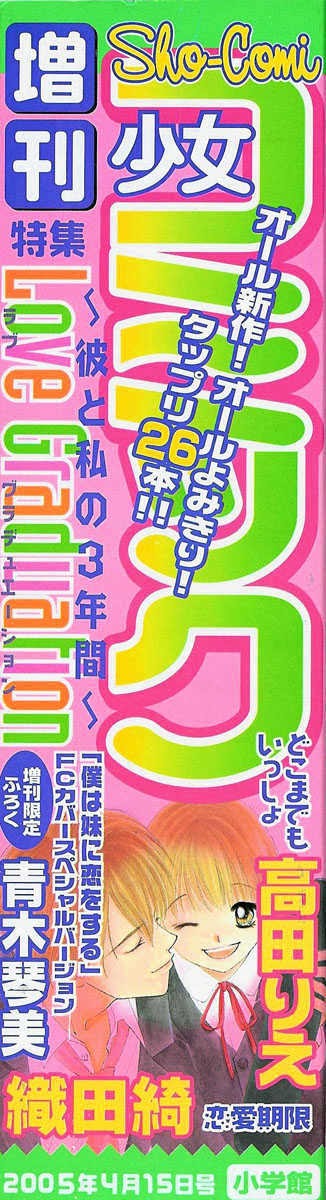 Love Graduation manga summary: Fujisaki Asuka has had a crush on Urabe Jun for three years. Days before the graduation, to her surprise, he asks her to be his girlfriend. But there's a catch, he actually wants her to pretend so other girls won't swarm around him. Asuka is disappointed, but for her, just being around him is enough. She decides to enjoy spending time with him while she can, but jealous girls aren't happy with the new "couple".
