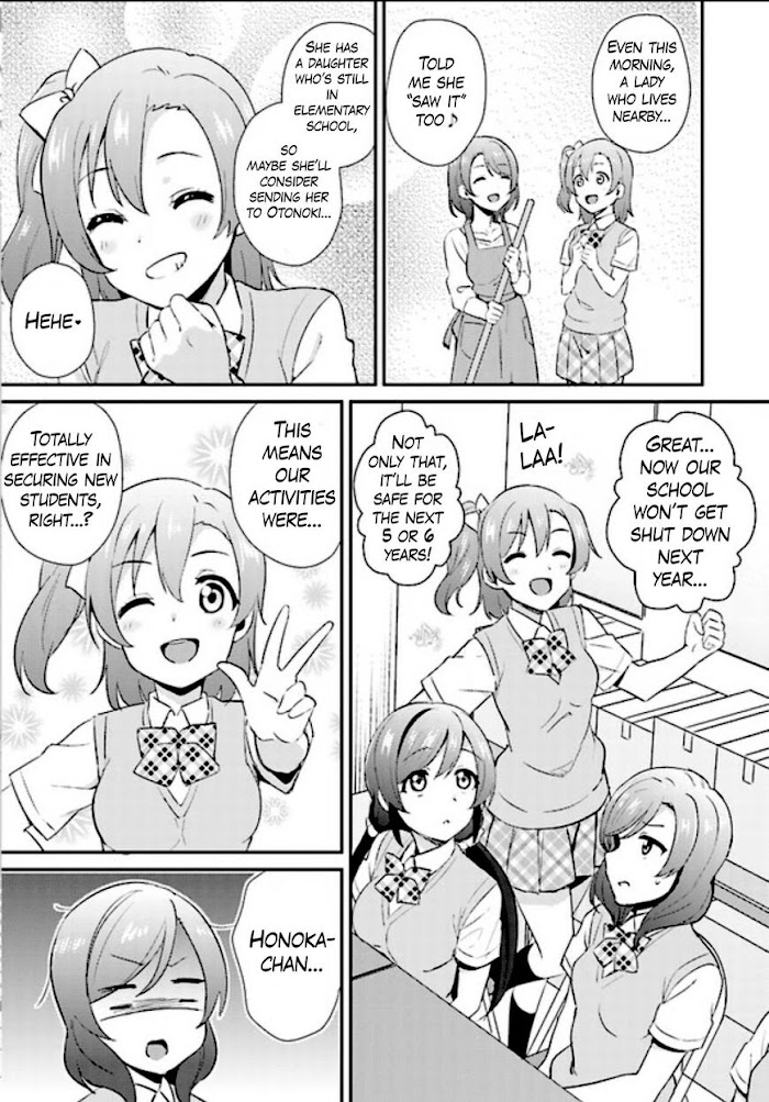 Otonokizaka High School stands on the border of three cities: Akihabara-a pop culture mecca that's evolving by the minute; Kanda-a conservative, cultured city where history and tradition reign supreme; and Jinbo-a quiet area reserved for a more mature, sophisticated population. Amidst this culture clash, the school now faces closure due to the enrollment of fewer and fewer students. With the school planning to close within three years, nine female students come together with one thing in mind-form a pop idol group to revive the school's popularity and keep it from shutting down. "In order to protect our beloved school, there's only one thing we can do...become pop stars!" Their goal is simple: Become an overnight sensation and use their nationwide media exposure to promote their school and bring in a wave of new students to the ailing area. A simple but solid plan, they figure. Naturally, they're nervous and wonder if this plan can really succeed, but for better or worse their new journey has begun... "All we can ask for is just a tiny bit of support from you. We truly believe that with your help, we can change the world around us. We will make our dreams come true!" (Source: NIS America)