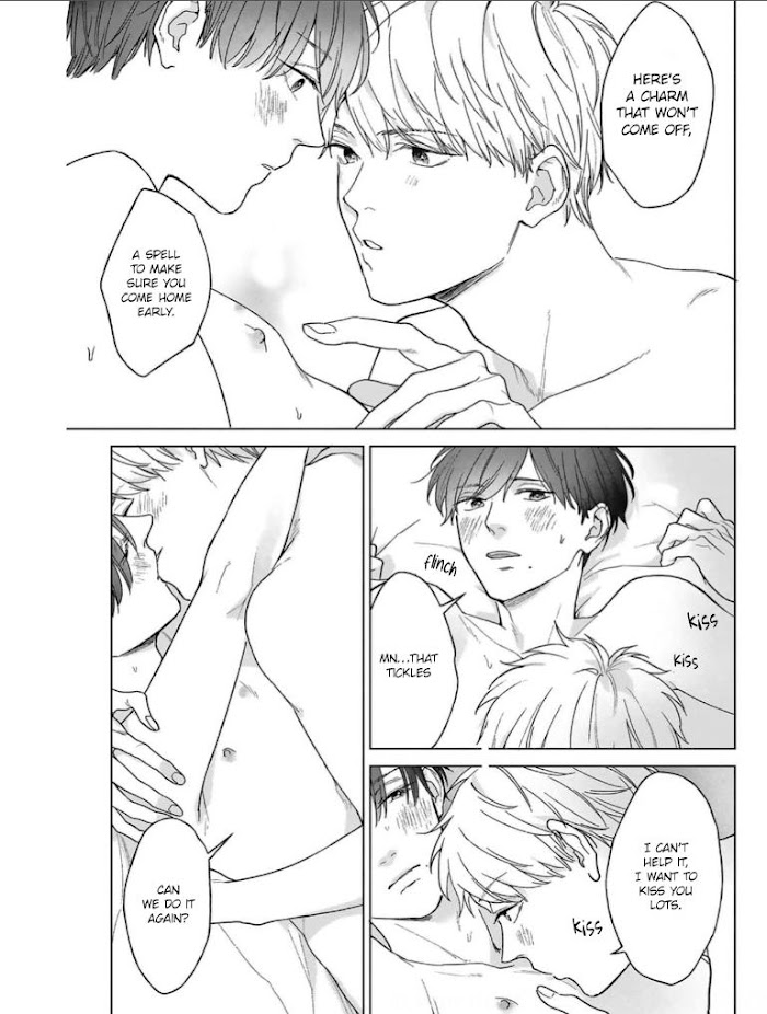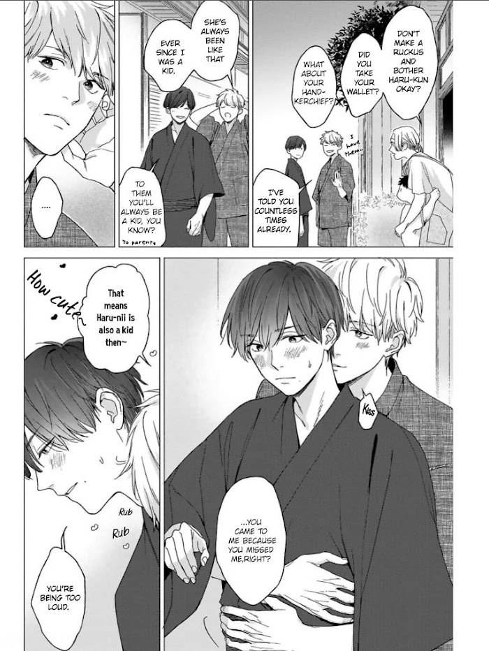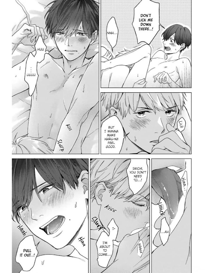 "I love you, Haru-nii. I want to be with you forever" Daichi, the son of the restaurant owners from Haru’s part-time job, has loved Haru since he was in elementary school. Haru loves him like a younger brother, but when Daichi, now in high school, kisses him like he used to as a child, Haru finds himself unable to accept his "I like you" from Daichi as honestly as he used to. Lastly, Haru couldn't look directly at Daichi naked body now he that he has a body of a grown man and is in high school...!? The story of a young puppy x an indecisive and timid older man that grow up doting on eachother? Includes free paper and electronic limited free paper!