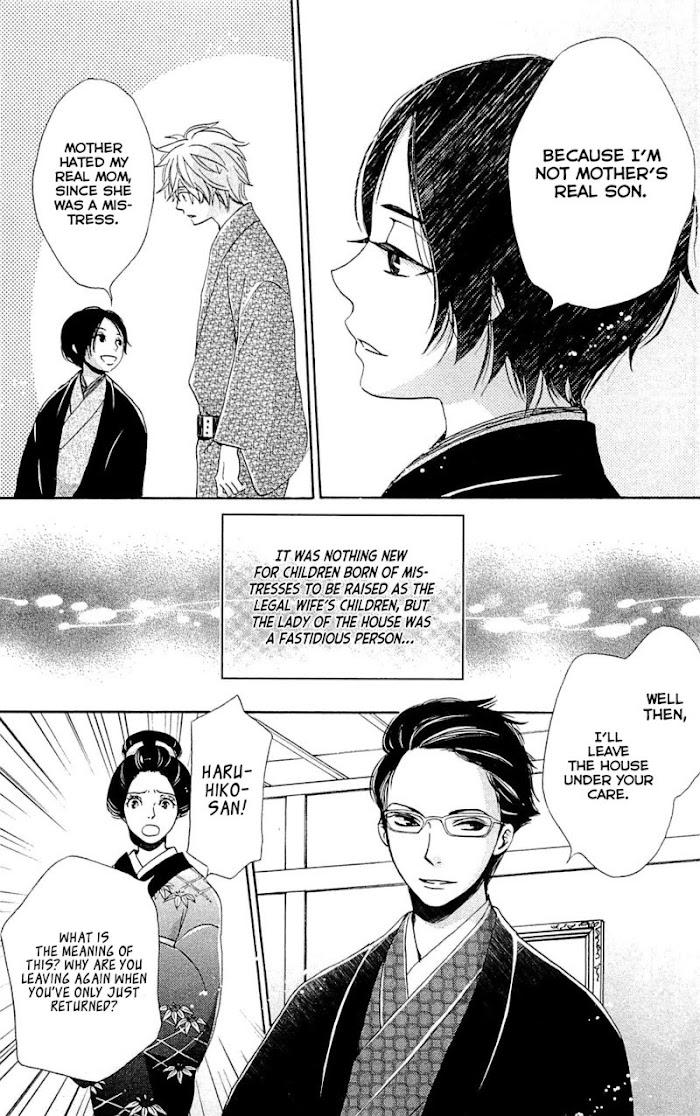 It's the middle of the Meiji Era and our heroine, the little Suzu, is sold to the red lights district. However, the rich heir of a dry-goods store Tsugaru buys her freedom for no apparent reason. She is deeply grateful for being saved, but she doesn't understand why he paid so much money for her and the only explanation he offers is "we have a bond." She tries to unravel the mystery of his feelings and gradually grows from a little girl to a young woman, always by his side. A gentle and slow-paced love story set in the Meiji Era. (Source: Aerandria)