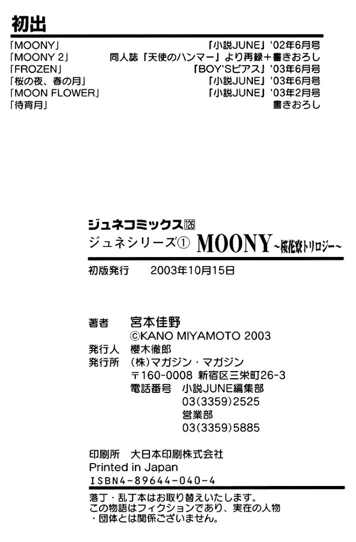 Moony - Oukaryou Trilogy manga summary: Collection of One Shots: Chapter 1-3: Moony & Moony 2 It all starts when Yuusuke Satou is forced to spend spring holidays at the dormitory along with Moriya. Then, one night Yuusuke discovers that Moriya has troubles seeing at night and while he takes care of Moriya he eventually falls in love with him, but he is worry that Moriya might not return his feelings and will hate him... Chapter 4: The Spring In A NIght of Cherry Blossoms Chapter 4.1: Waiting For The Moon ~ Extra Chapter 5: Moon Flower