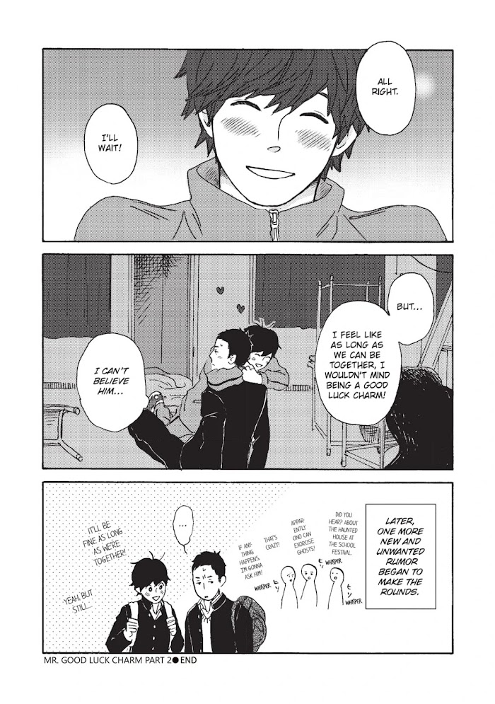 A collection of stories about relationships in transition...--"Yokoi's Calligraphy Catastrophe": If Yokoi were a doctor, he wouldn't have to be so self-conscious... After another incident of his boss double-checking the contents of a note from Yokoi, he decides to do something about his poor penmanship. Perhaps calligraphy classes can rescue his chicken scratch writing... But what if the teacher makes his hands tremble even more!?"Licky's Dogma": For Shinobu, it was love at first sight. But Kiichi was too preoccupied with his dog Licky... Will Shinobu ever be able to live up to man's best friend? "Mr. Good Luck Charm": Futoshi Ono has been held back a year. He frequently misses school and often has an injury, usually on his face. Everybody thinks he's your typical delinquent who skips classes and gets into fights. But in reality, Futoshi is getting beat up... by spirits! Amulets and talismans only go so far. What Futoshi really needs is a good luck charm...!+