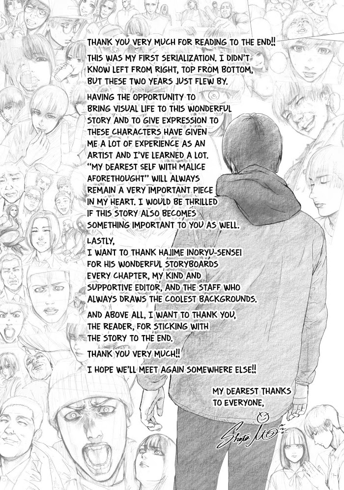 My Dearest Self with Malice Aforethought manga summary: Urashima Eiji, a college student, goes to sleep after a fun drinking night with his friends. When he wakes up he discovers a beautiful girl next to him who treats him as if they are in a loving relationship. Later, Eiji finds out that 3 days have passed since he went out with his crew. What did he do during all that time and why does he have no memory of it? By confronting that reality, he will be caught in tragedy...