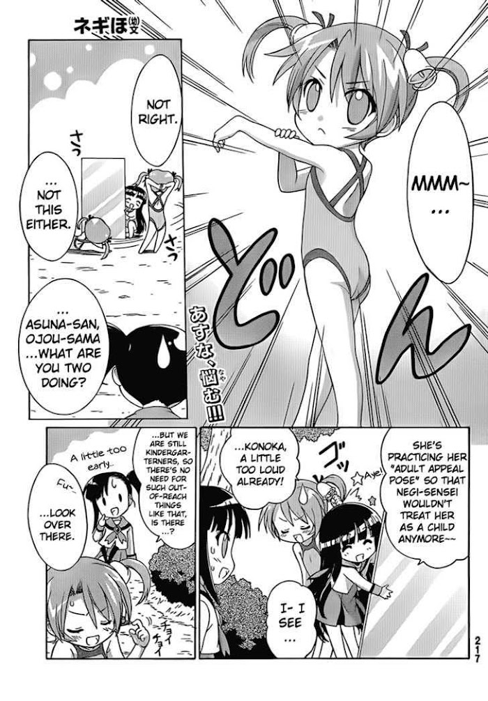The plot centers around the girls in the class of 3-A, only this time, they're kindergarteners. Their teacher also seems to be Negi, only this time, he's the older one. It looks like Asuna is crushing on her teacher, too!