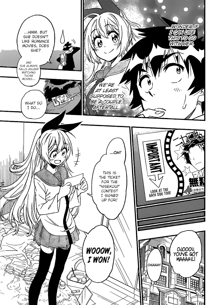 When Raku Ichijou was young, he made a heartfelt promise to his childhood friend that if they were to meet again, they would marry each other. Ten years have passed since that fateful day, leaving Raku's memory of her faded. But he still holds a relic of their relationship together-a locked pendant, which his childhood friend holds the key to. He hopes to reunite with her one day, despite not remembering what she looks like. Now a first-year student at Bonyari High School, Raku attempts to live a normal life, dreaming of becoming a public servant and marrying his crush Kosaki Onodera. However, this isn't as easy as it seems, as he is the unwilling heir to a large yakuza family, and Raku can't escape from his duties when the American Bee Hive gang wages war on his family's turf. In order to forge peace between the two feuding families, Raku is forced into a fake romantic relationship with Chitoge Kirisaki, the beautiful daughter of the Bee Hive's leader. The two quickly come to hate each other, but have to learn to live together and pretend to be deeply in love in order to keep their families at bay. However, Raku's quest for the key to his pendant isn't becoming easier as more girls-who were all involved with his pendant in some way-enter his life. Join Raku as he juggles his false relationship, maintains the balance between warring families, and unravels the identity of the girl who will unlock his heart. [Written by MAL Rewrite]
