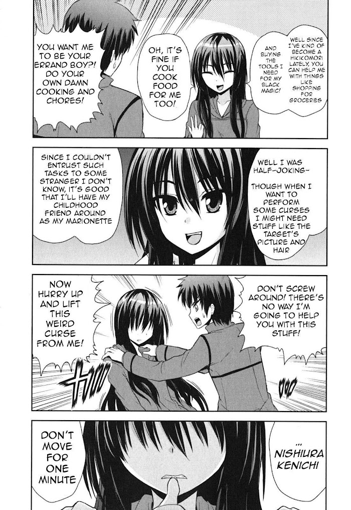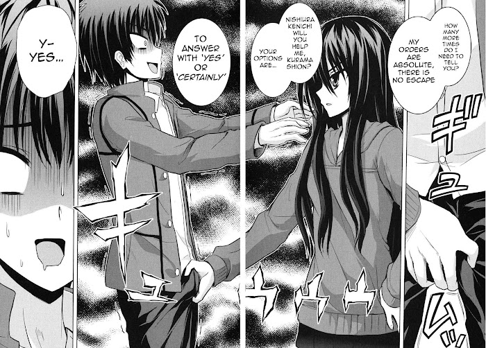 One day, high schooler Nishiura Kenichi was tasked to check if his classmate, Kurama Shion, was still alive. Shion has not shown up to her classes in the past two months, and the teachers were getting worried. When Kenichi arrives at her place, she decides that he would make a good test subject for her recently acquired black magic powers. With her black magic curse, she turns Kenichi into her personal slave. The life of Shion, the master of the black arts destined to take over the world(?), and her loyal slave Kenichi begins here! (Source: MangaHelpers)