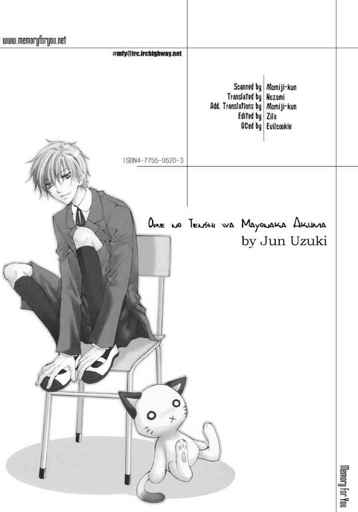 Good vs. evil, love vs. ...more love?! Fujiki Tomo is a teacher whose newest transfer student is as cute as an angel. The adorable boy's name is Shiina Kazunari. However, when Fujiki sees something unbelievably cute, his nervousness always frightens it away. So, Fujiki is working hard to correct the problem for his darling Shiina's sake, but that's when a delinquent steals a kiss from our troubled teacher! Who is this devilish delinquent, and where did he come from? And why does he bear such a strong resemblance to the angelic Shiina? (Source: DramaQueen) Included one-shots: My Angel is a Demon; Please Lock the Door; Homura